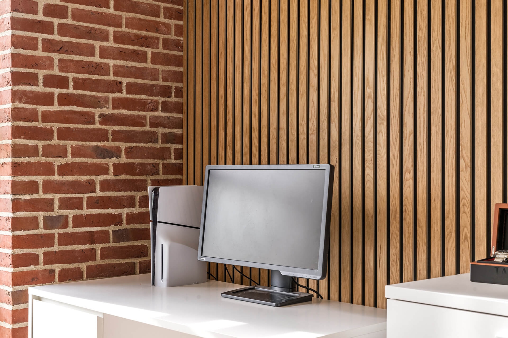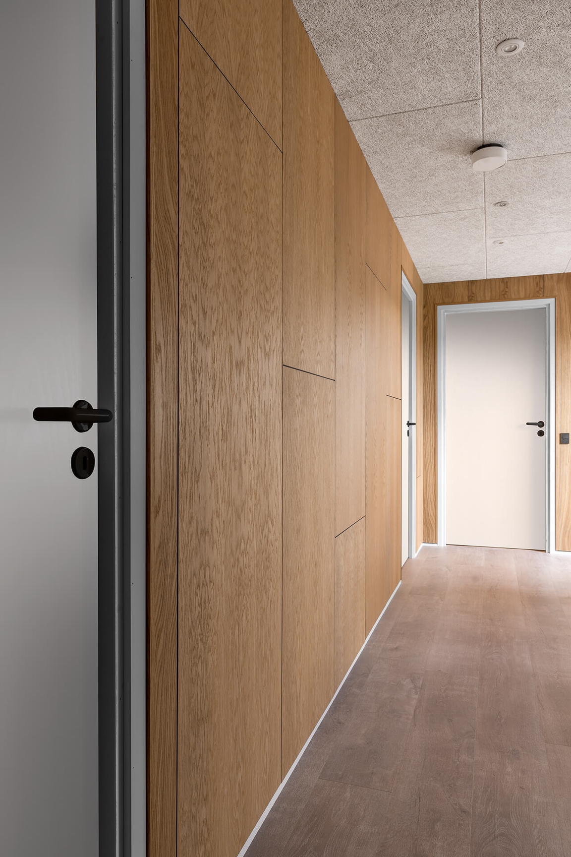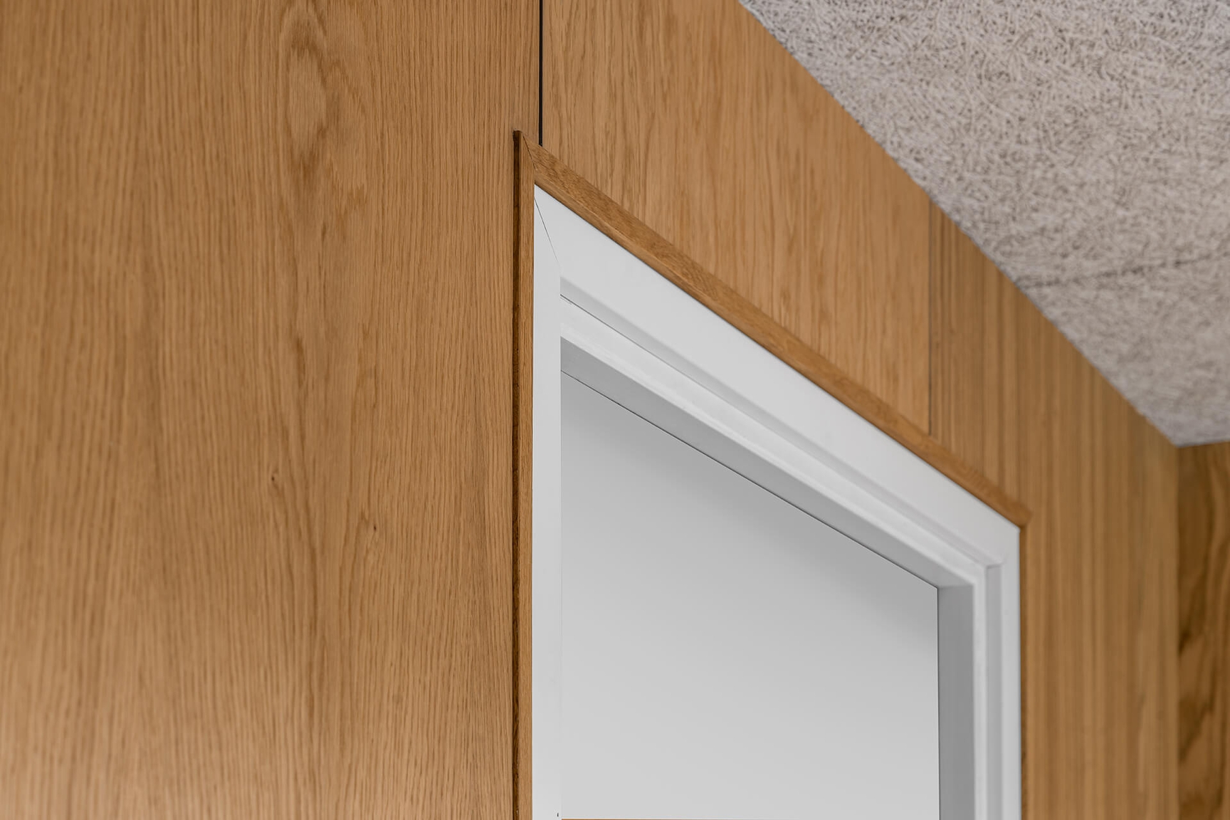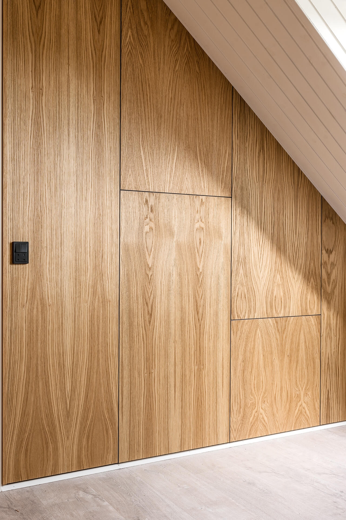 I-Wood Denmark® hat einem Flur im ersten Stock eines privaten Hauses mit UniPanels neues Leben eingehaucht. Mit schönen Holzoberflächen und eleganten Verbindungen verleihen die UniPanels dem Raum Wärme und Ruhe. In dem kleinen Raum wurden die Wände genutzt, um Charakter und Persönlichkeit zu schaffen. Gleichzeitig wird die Natur durch die natürliche Struktur und Farbe des Holzes in das Design integriert, was die Räume mit einem stilvollen und harmonischen Element verbindet.