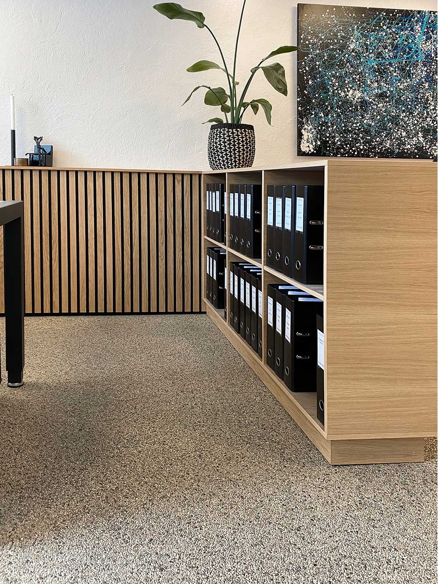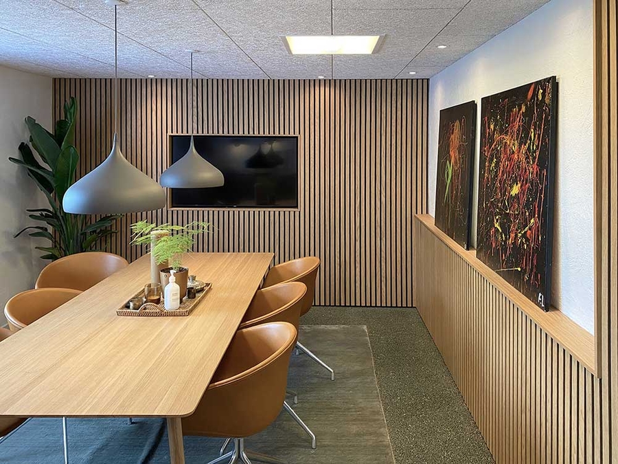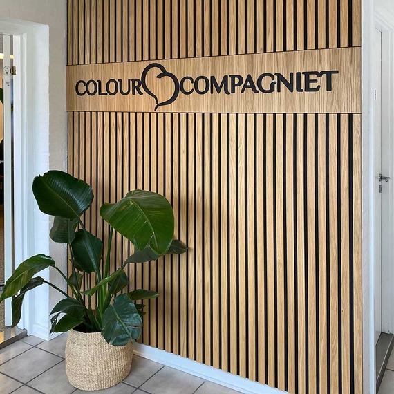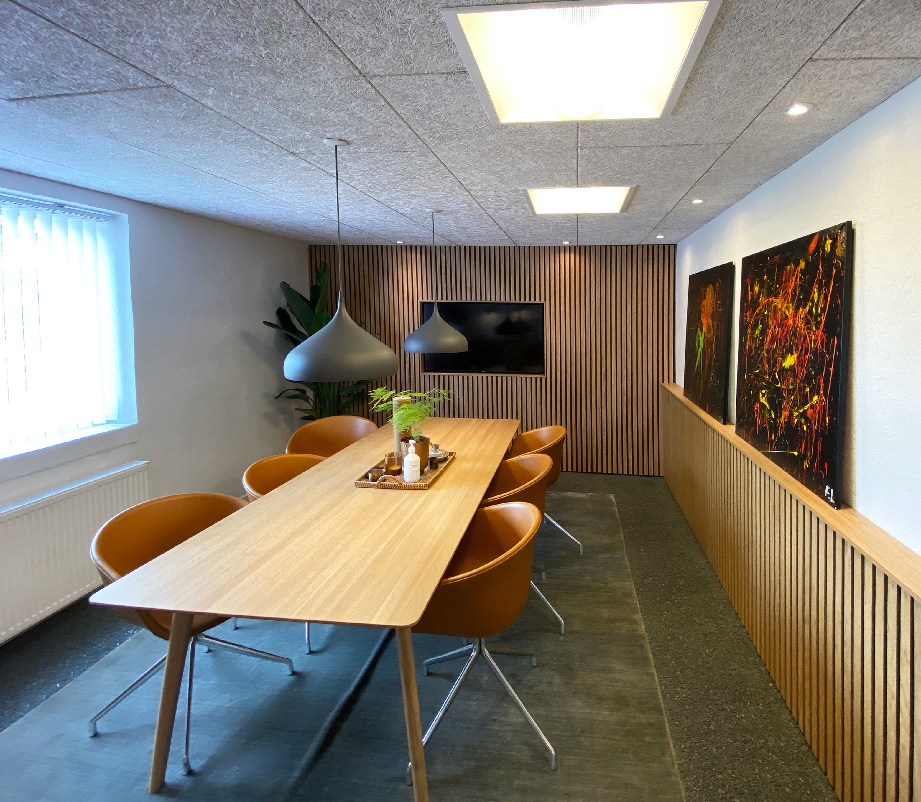 Das Büro und der Besprechungsraum von Colour Compagniet in der Nähe von Herning wurden mit Akustikpaneelen von I-Wood Denmark® ausgestattet. Die Paneele eliminieren unerwünschten Lärm und Hall und schaffen so eine bessere Arbeitsumgebung. Darüber hinaus sorgen die Paneele für eine ästhetische Ausstrahlung in dem Unternehmen, das selbst mit schönen Oberflächen arbeitet.