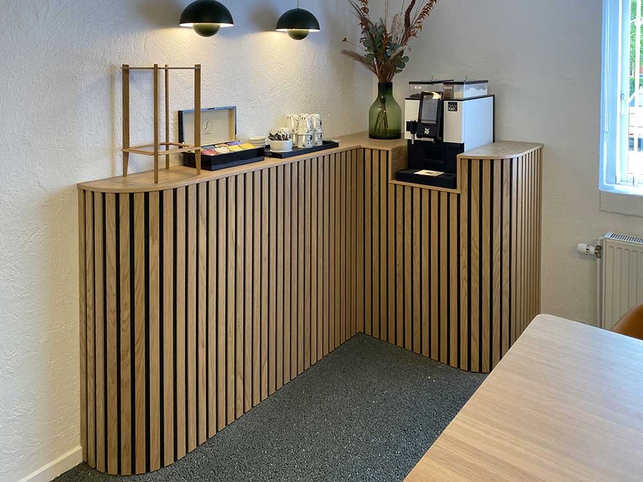 Das Projekt bei Colour Compagniet umfasst sowohl traditionelle Wandpaneele als auch maßgefertigte Lösungen mit integrierter Kaffeebar und Regalen.