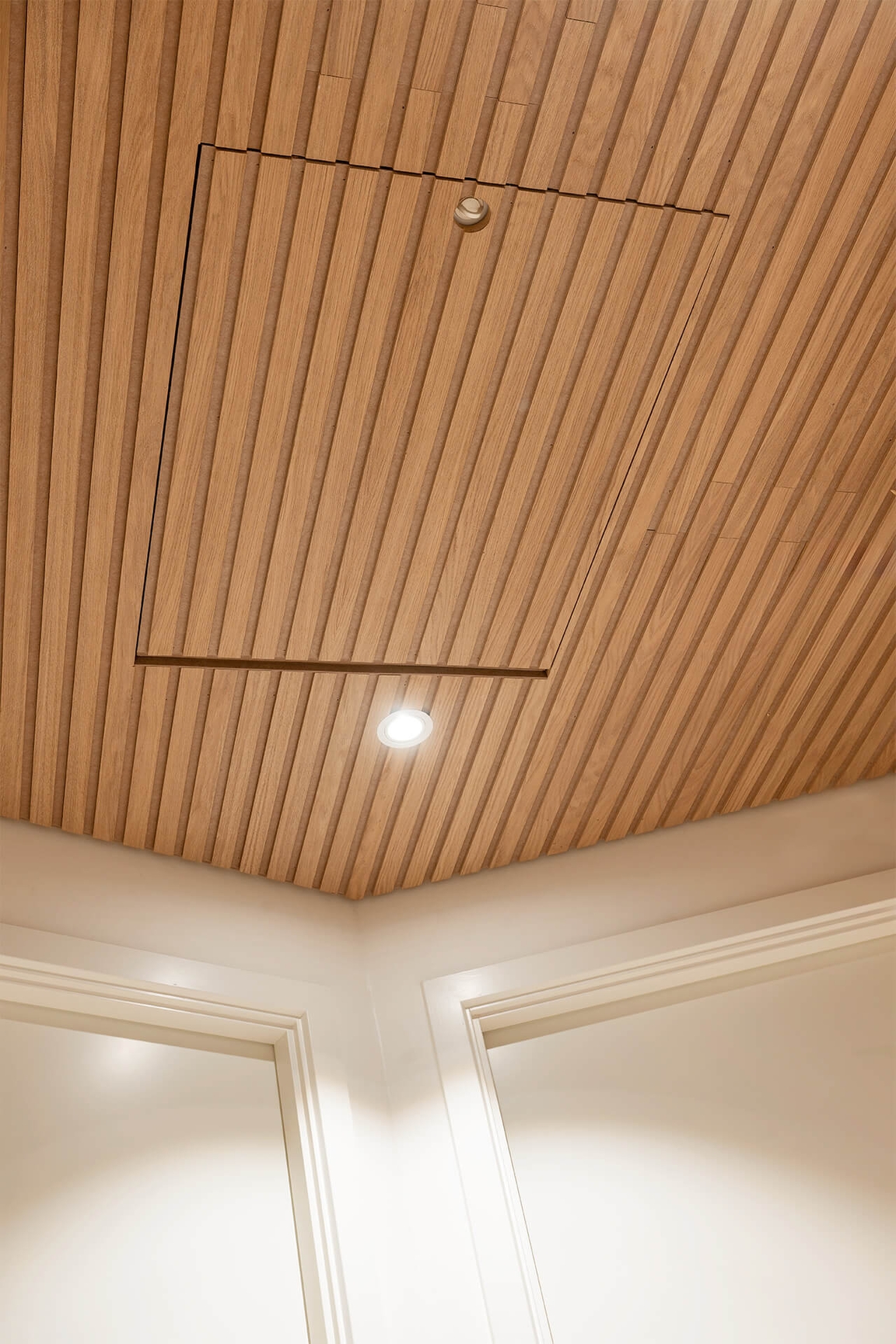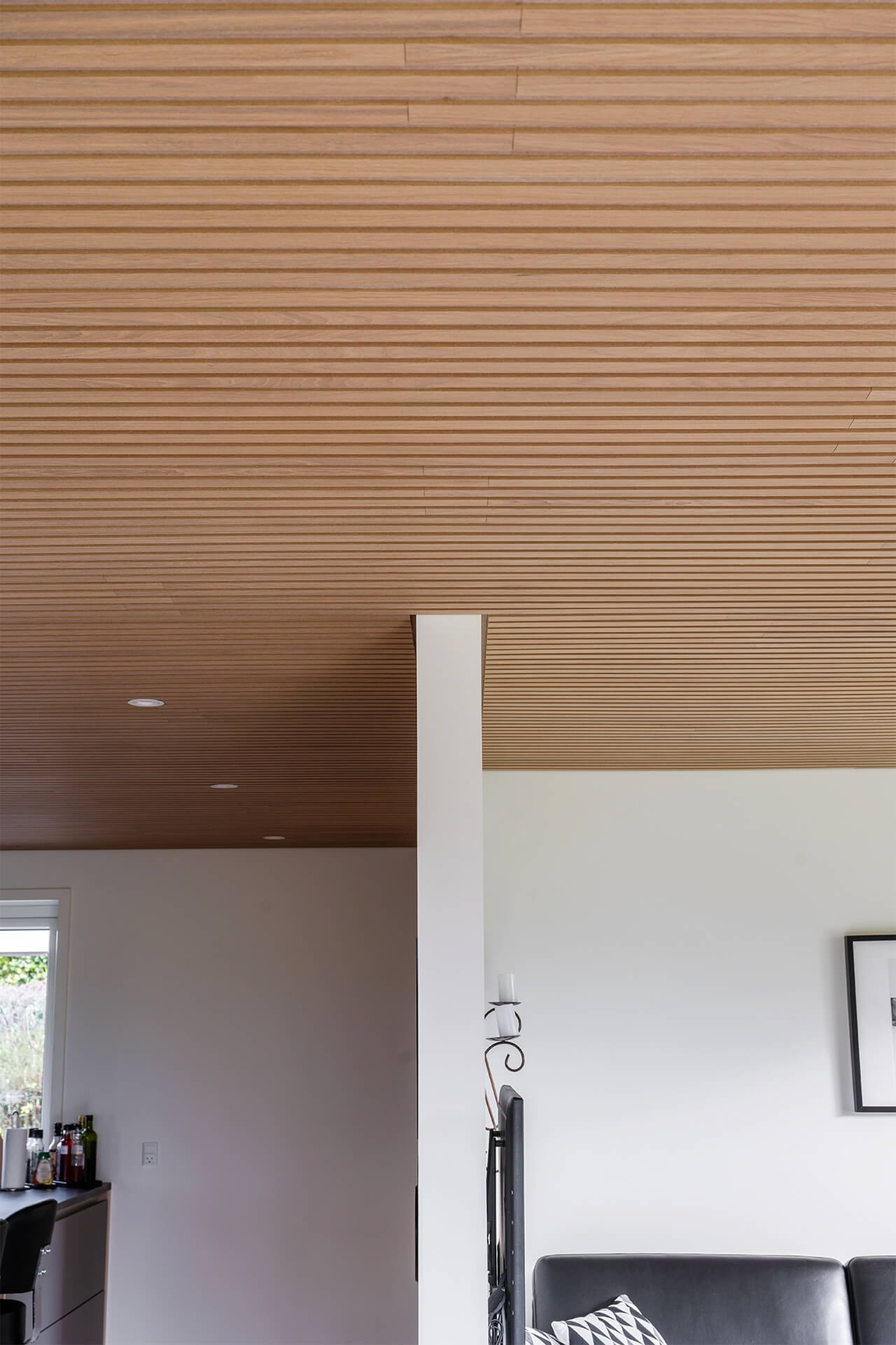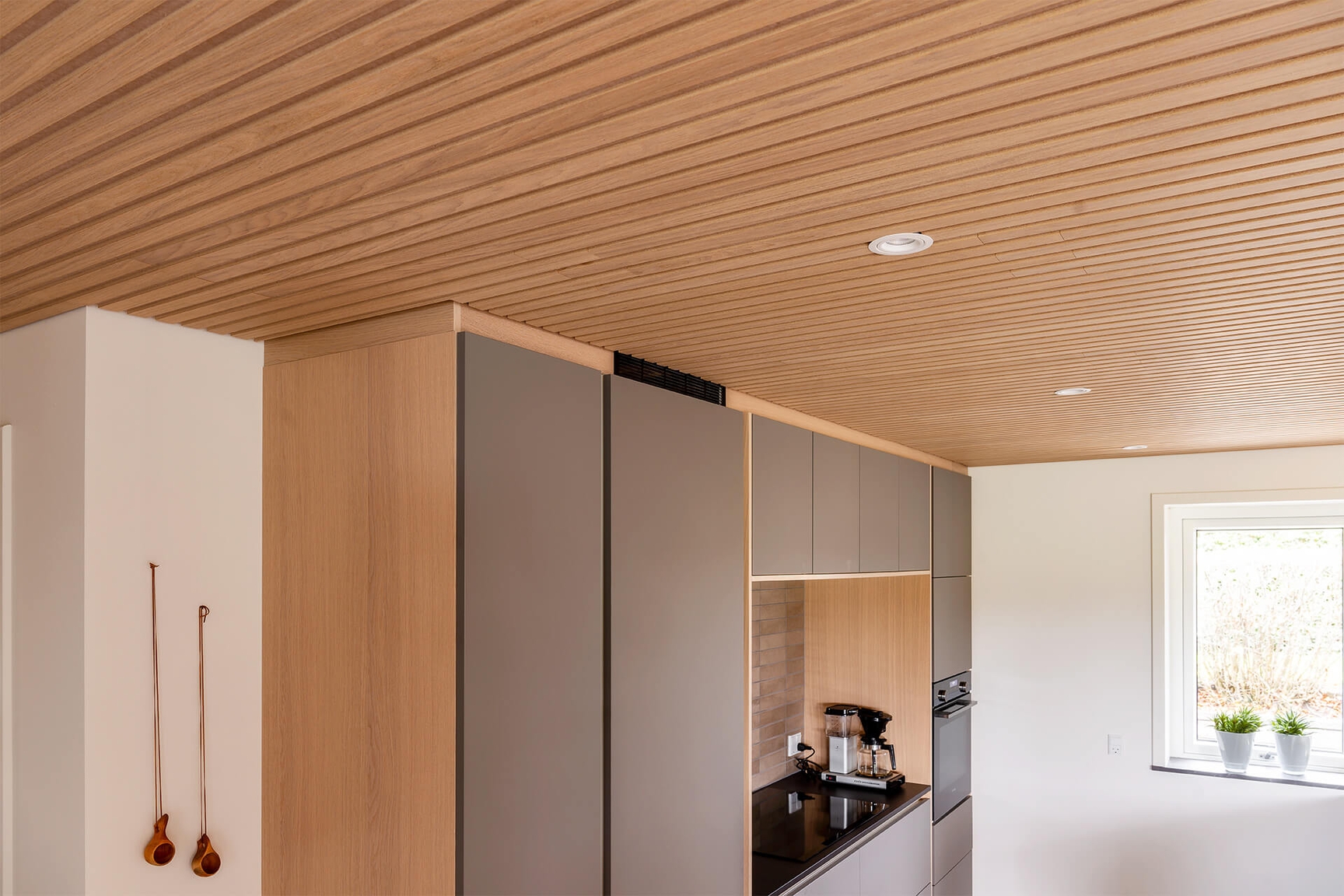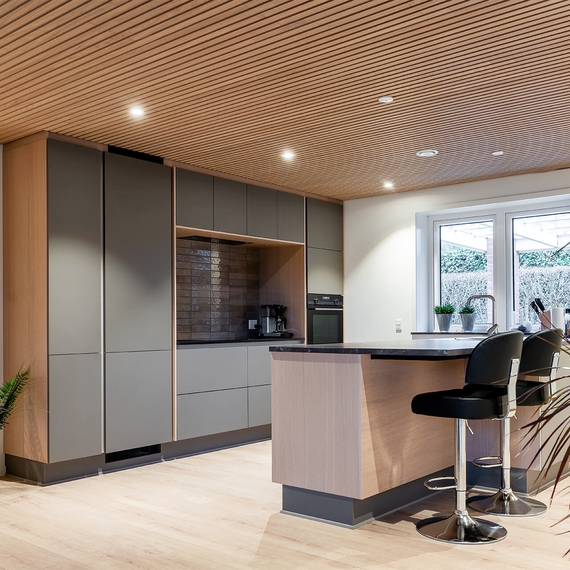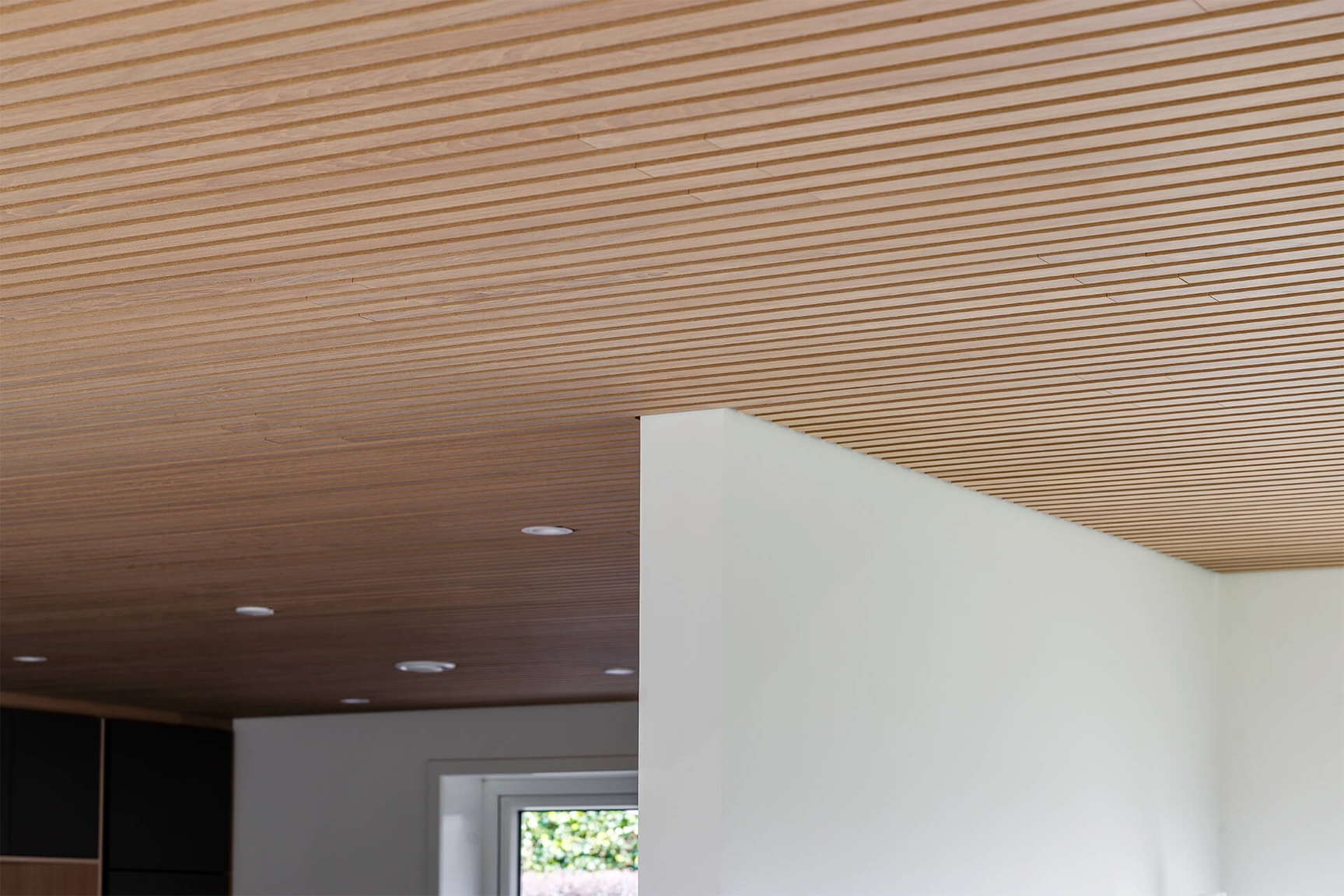 I-Wood Denmark® hat die Ästhetik und Funktionalität eines klassischen Hauses aus den 70er Jahren aufgewertet. Während der Renovierung wurde die Decke durch Deckenpaneele mit beigem Filz ersetzt. Indem der Ton-in-Ton-Trend aufgegriffen wurde, entstand eine natürliche und elegante Verbindung zwischen der Decke und dem Rest des Raumes, die ein Gefühl von Kohärenz und Harmonie bietet. Entworfen sowohl für das Auge als auch für das Ohr. Die weichen und warmen Töne des hellen Filzes verleihen eine moderne Note, während die Akustikpaneele unnötige Nachhall entfernen.