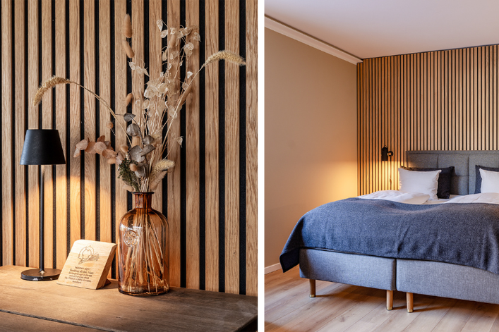 Das Projekt entwickelte sich schnell weiter und umfasst heute nahezu das gesamte Hotel. Die Akustikpaneele sorgen inzwischen für einen durchgehenden Ausdruck in Restaurant, Kaffeestationen, Garderoben und Hotelzimmern – wo sie als Kopfteil, Nachttisch und Schreibtisch integriert sind. Die Kombination aus Ästhetik, Funktionalität und Qualität schafft ein Ambiente, das gleichermaßen ruhig, warm und einladend wirkt.