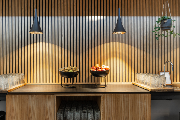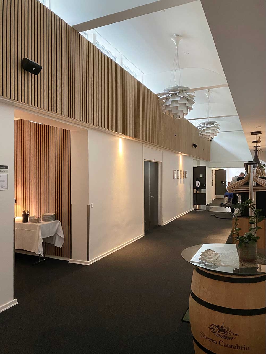 Die Lösung waren Akustikpaneele von I-Wood Denmark®. Die Paneele reduzieren nicht nur den Geräuschpegel, sondern haben auch eine diffuserende Wirkung, die Schallwellen gleichmäßig im Raum verteilt und so ein angenehmes Klangerlebnis schafft. Die akustischen Eigenschaften der Paneele wurden in Zusammenarbeit mit Force Technology getestet.