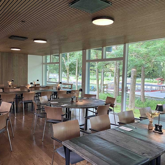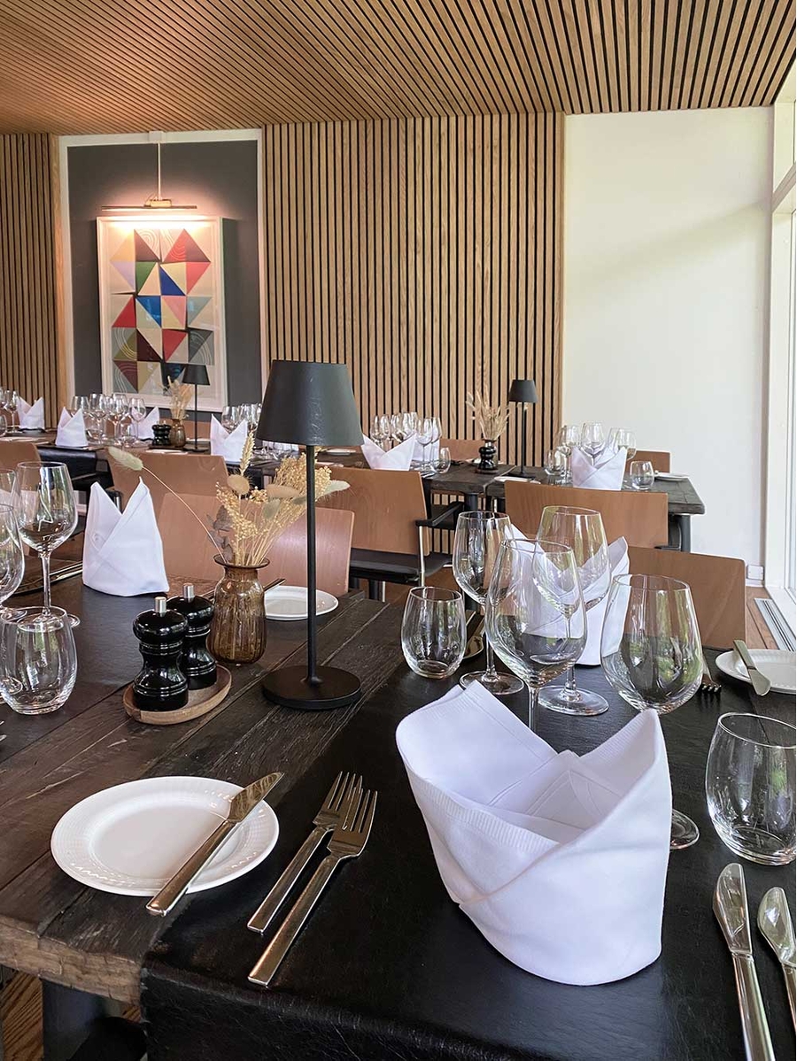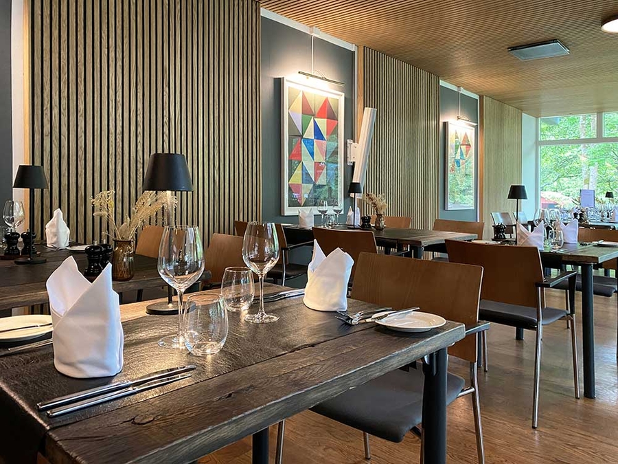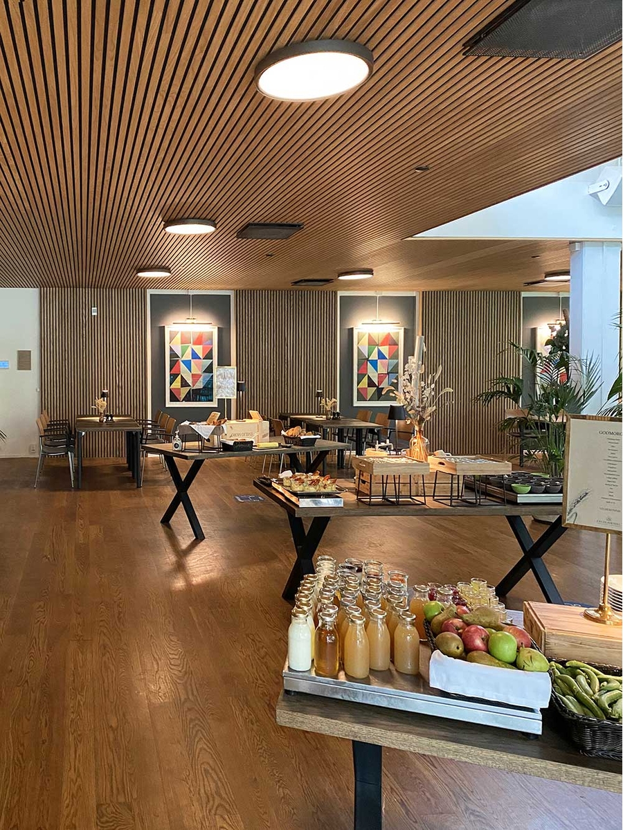 Die Zusammenarbeit mit Frederiksdal Sinatur begann im großen Hotelrestaurant mit 202 m², Panoramafenstern und Blick auf den Fluss. Die Herausforderung bestand darin, die offene Aussicht und das natürliche Licht zu bewahren – ohne Kompromisse bei der Akustik einzugehen.