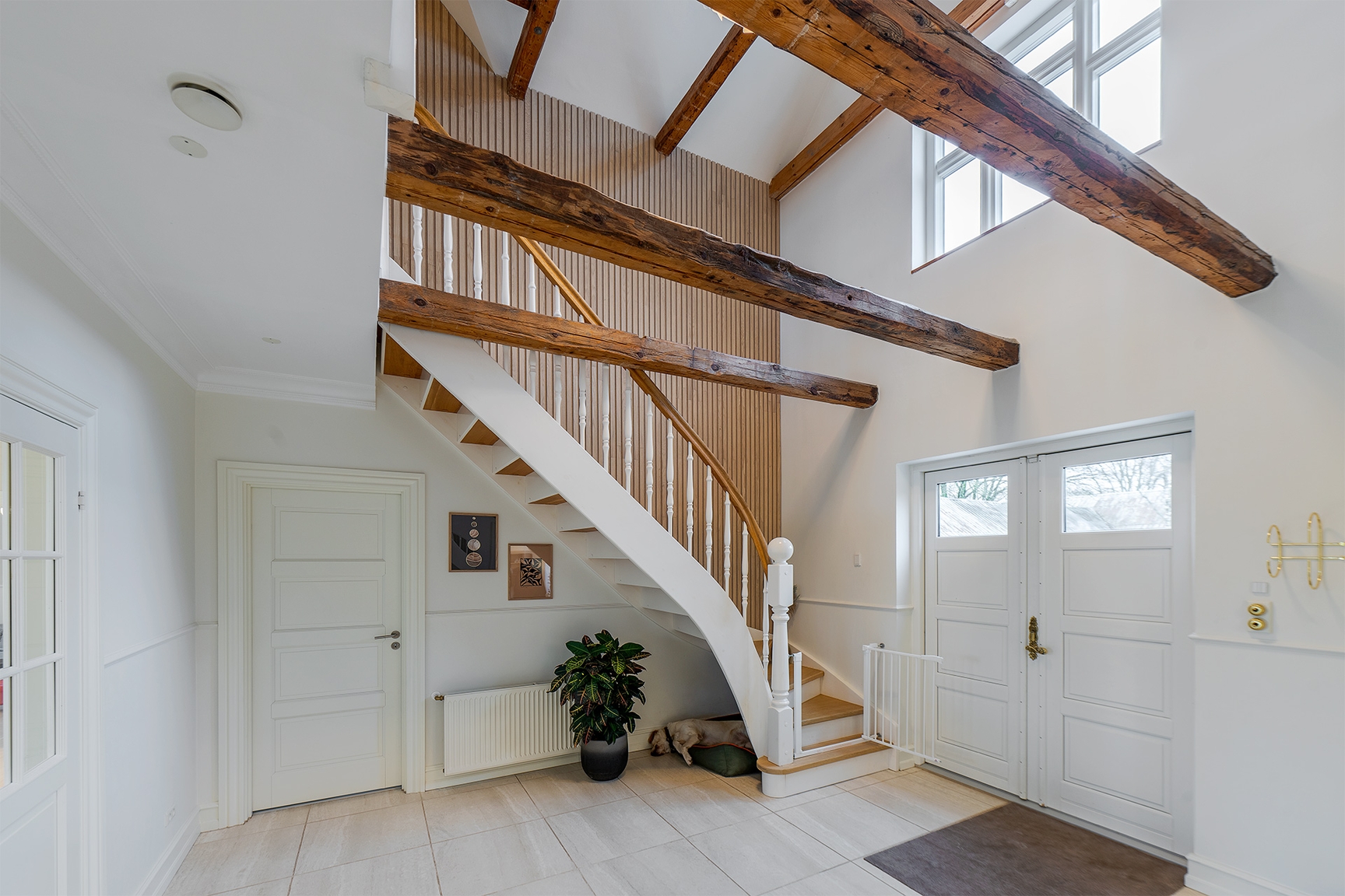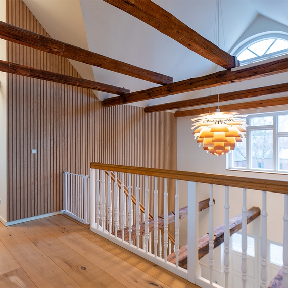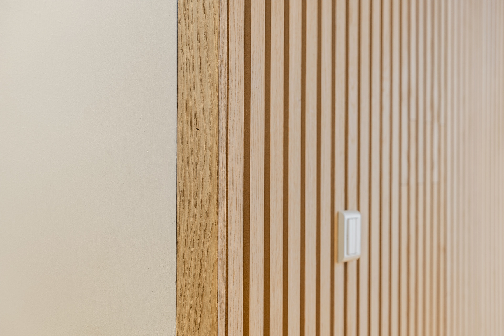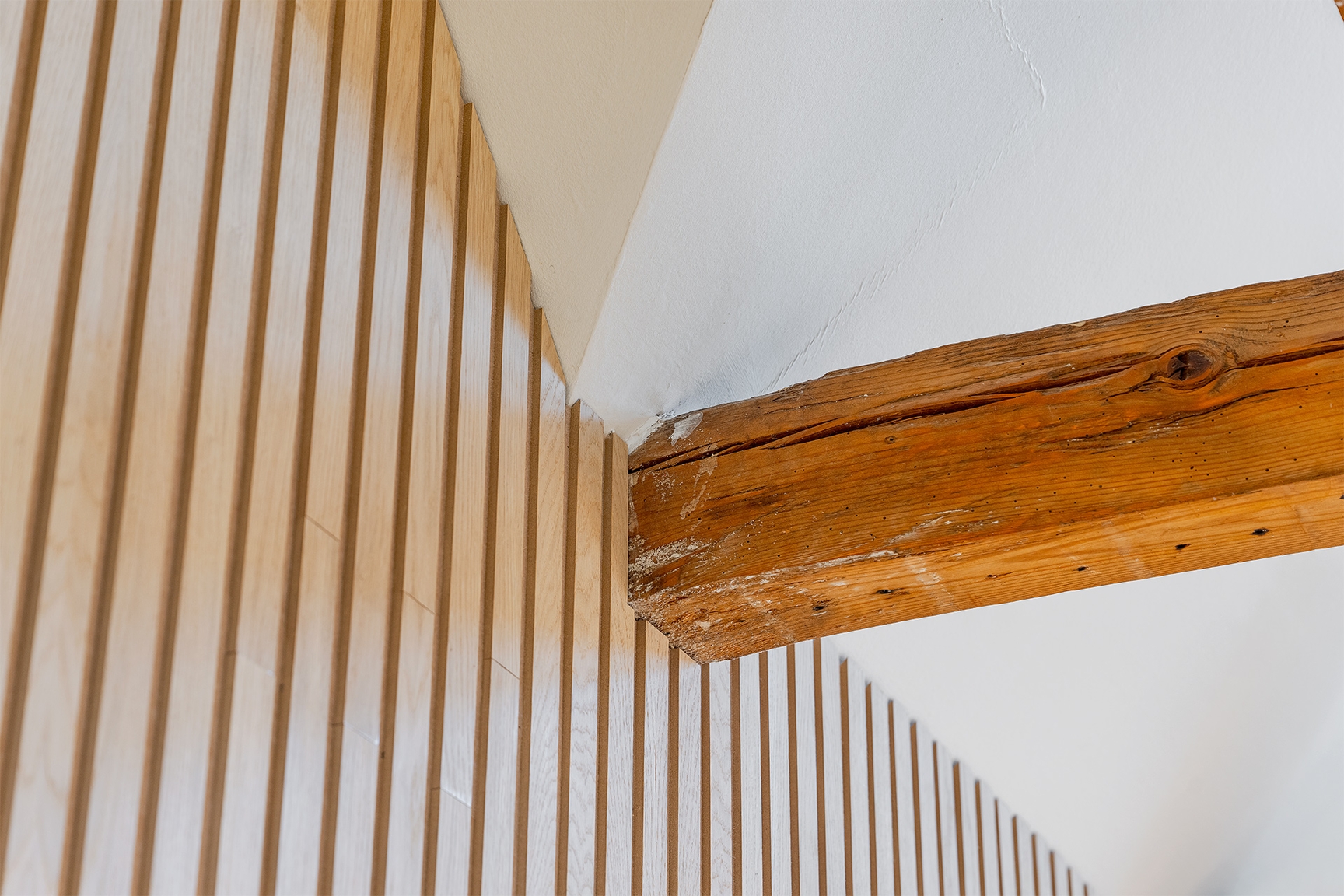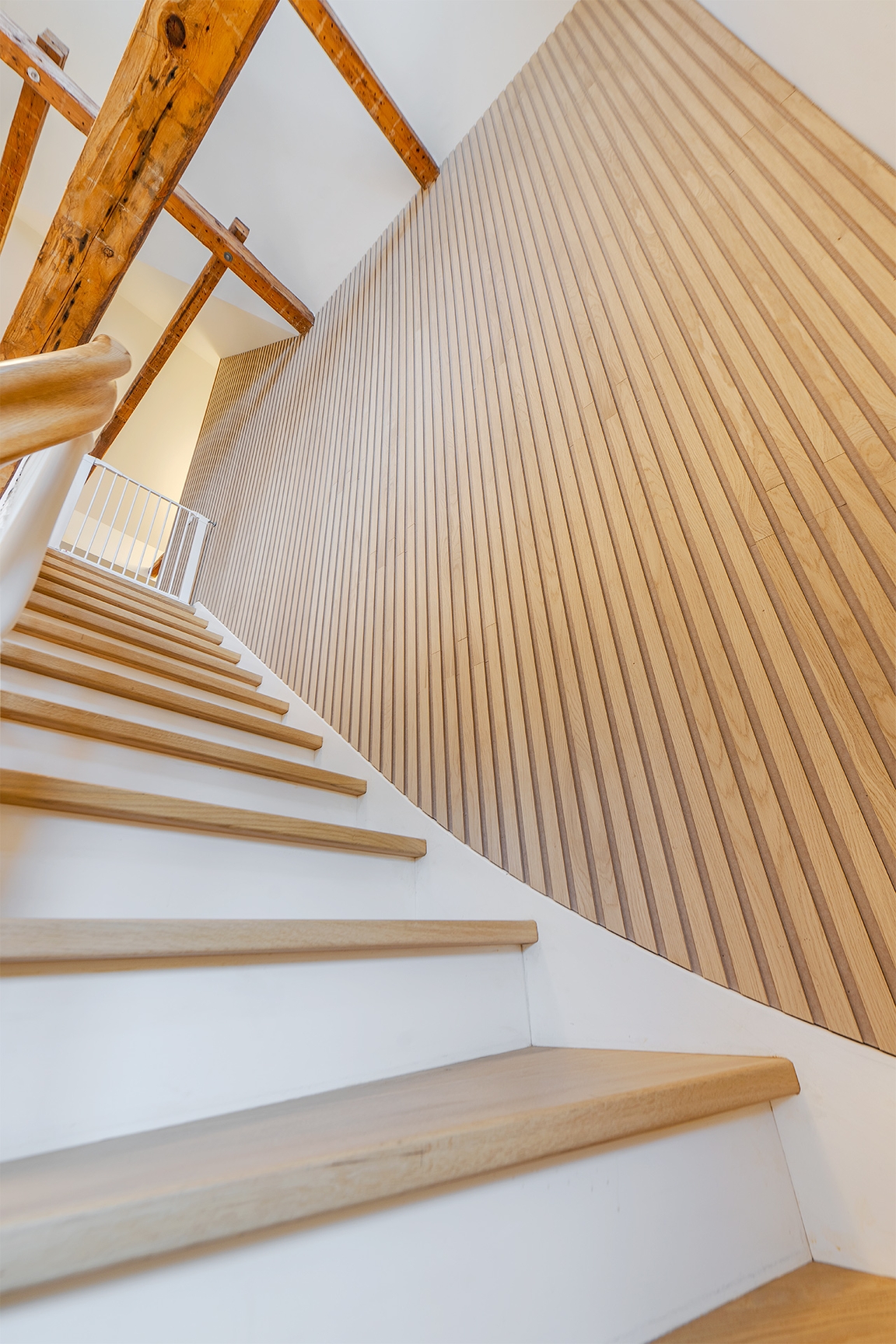 Wandpaneele mit beigem Filz sind an der Treppe zum 1. Stock montiert. Hier schaffen sie eine einladende Atmosphäre vom ersten Schritt ins Haus. Das Einzigartige an diesem Projekt ist das Zusammenspiel zwischen den modernen Paneelen und den originalen Holzbalken. Dieser Kontrast hebt die schönen Details der Abschlüsse hervor und schafft eine visuelle Verbindung zwischen den historischen Elementen des Hauses und modernem Design.