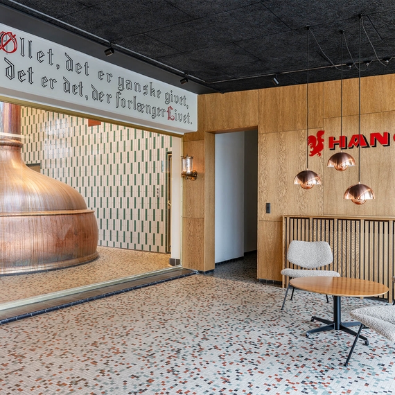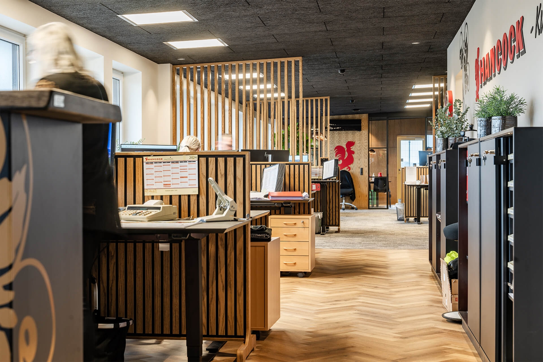 I-Wood Denmark® hat mit seinen stilvollen Akustikpaneelen eine moderne und einladende Atmosphäre in den Büros der Hancock-Brauereien geschaffen. Die markanten Holzoberflächen verleihen einen exklusiven Touch, der die Kupferbraukessel wunderschön ergänzt und eine zeitgemäße Interpretation der Dekoration der 1950er Jahre bietet. Gleichzeitig verbessern die Akustikpaneele sowohl in Flexi Frame als auch in Flexi Wall die Büroakustik und sorgen für optimale Raumteilung.