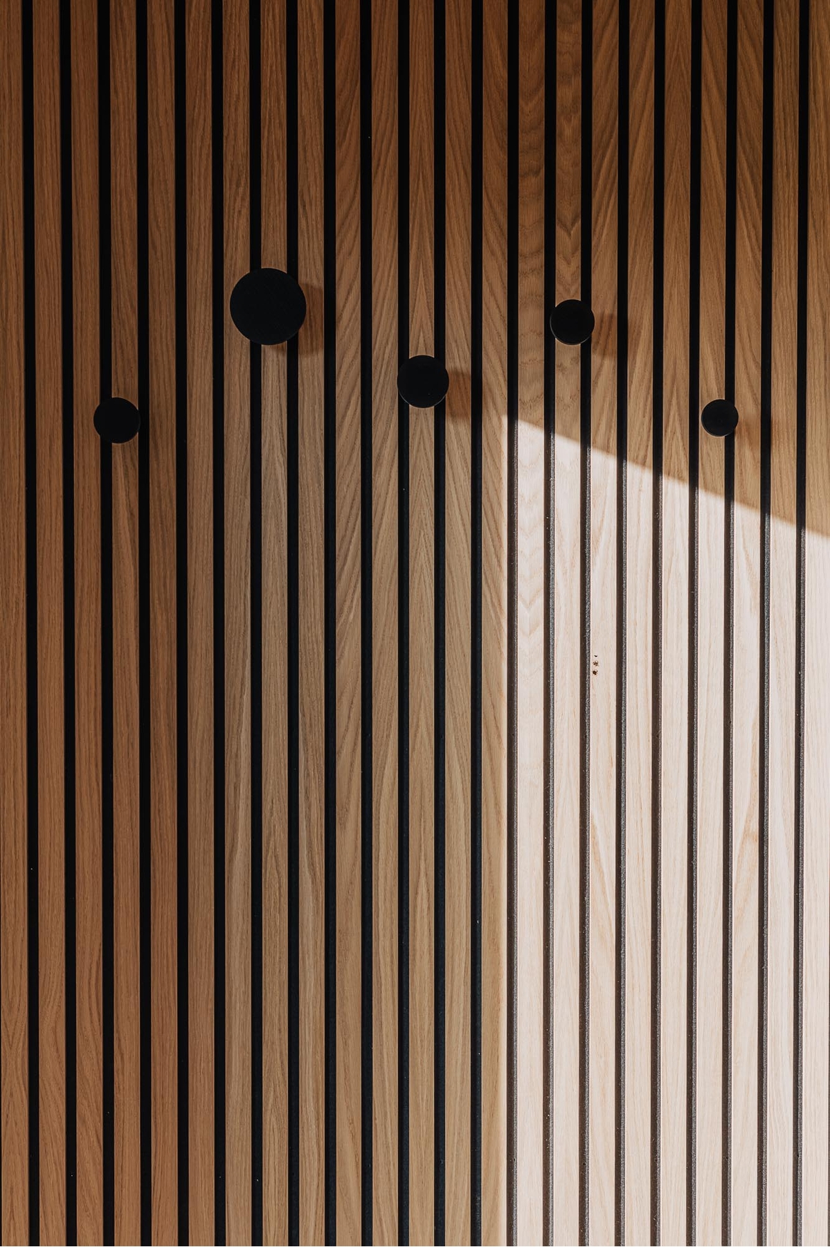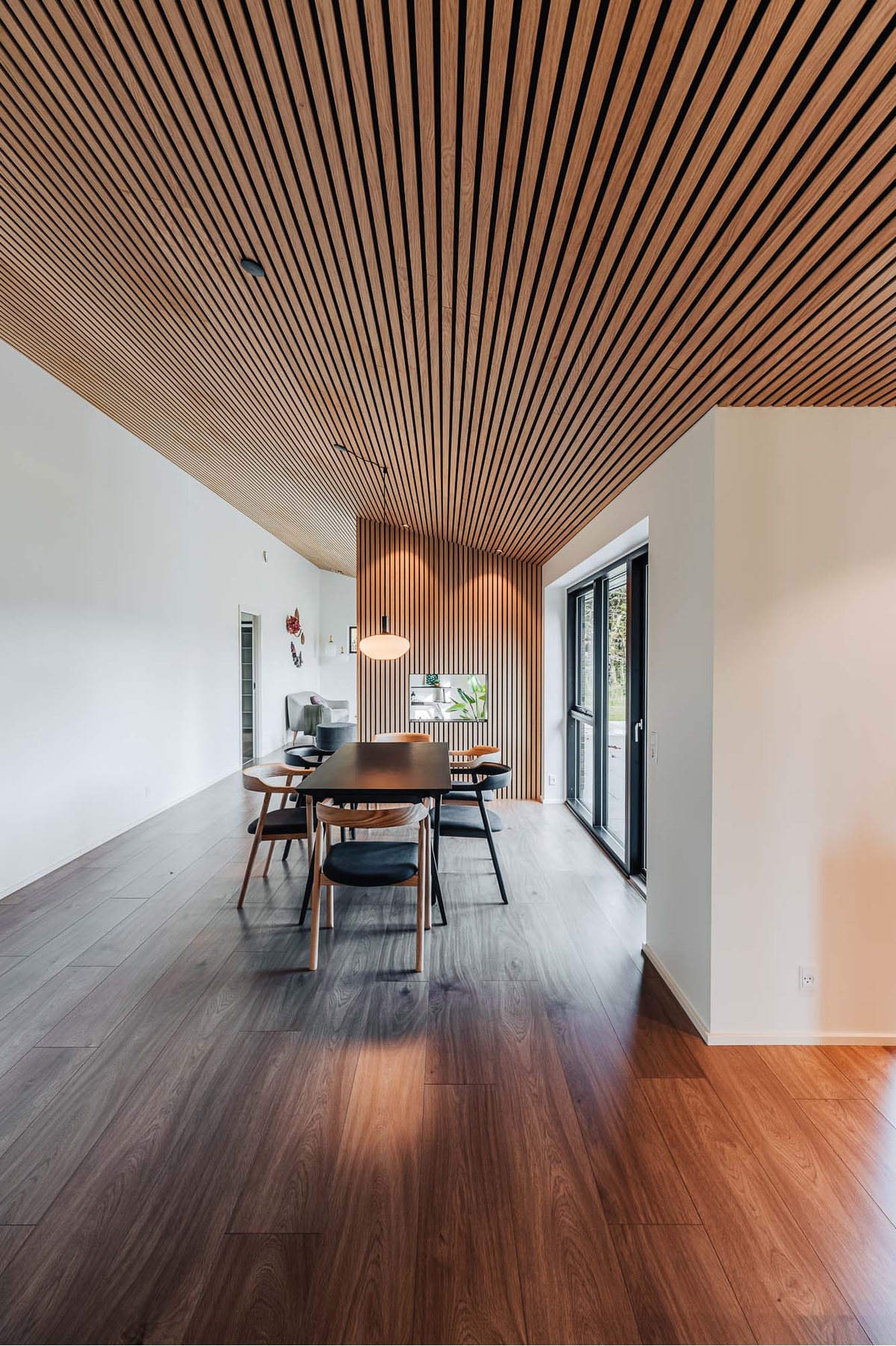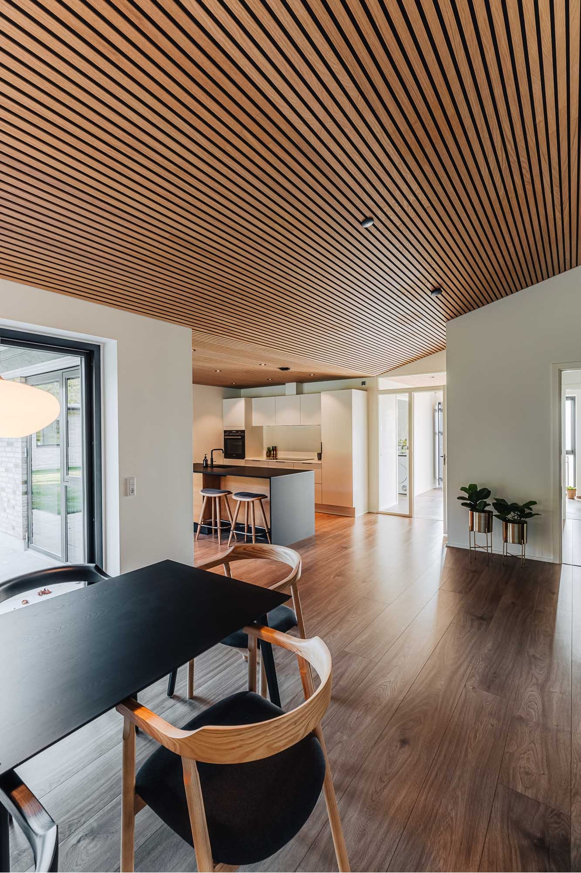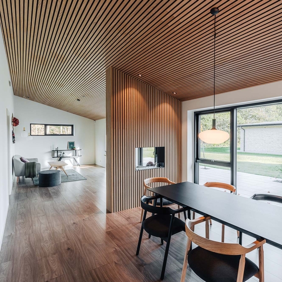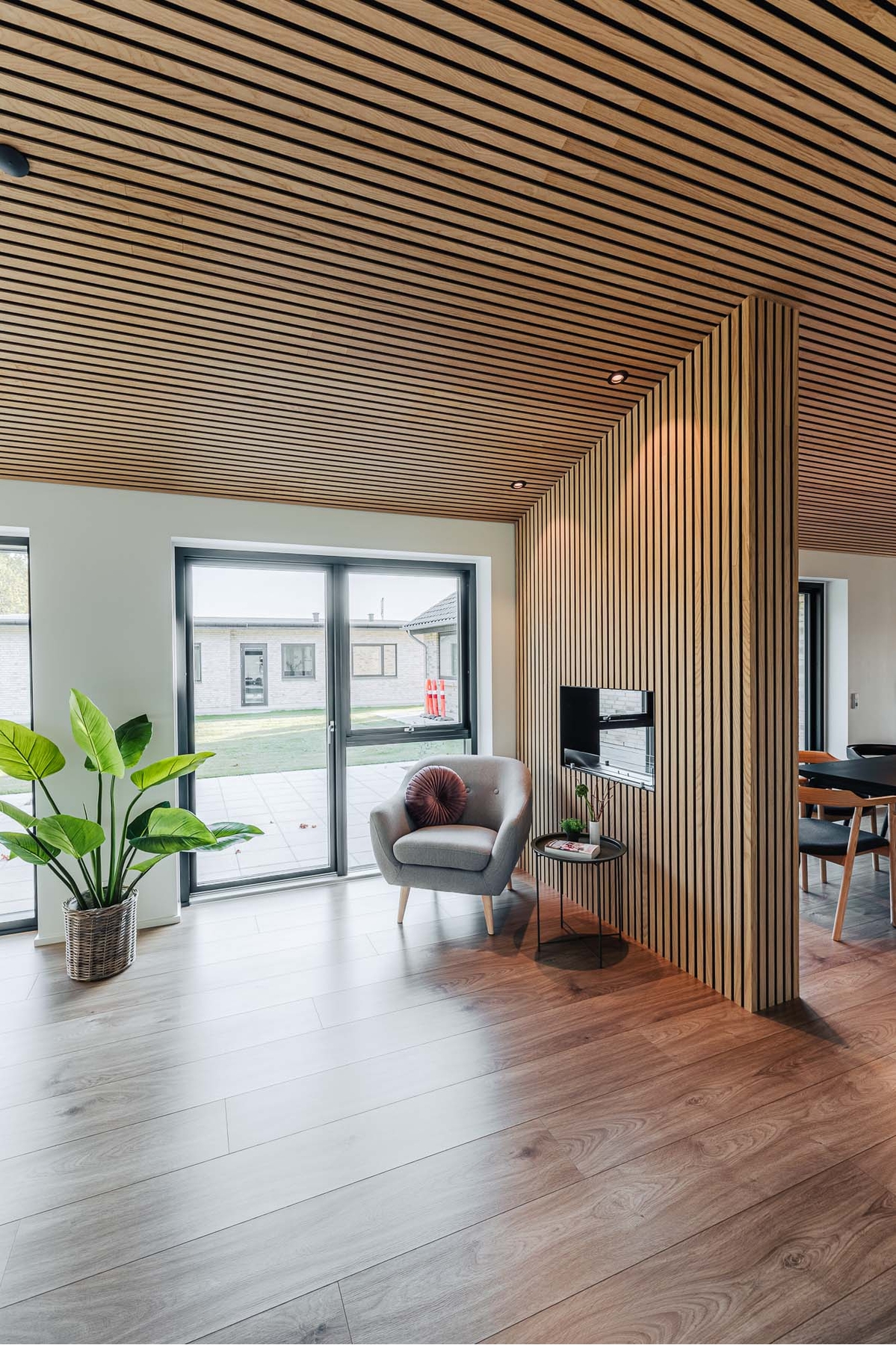 Wenn Kaufinteressenten bei Ide-Huse Musterhäuser besichtigen, können ihnen sowohl an den Wänden als auch an der Decke Holzpaneele von I-Wood Denmark® begegnen. Auf diese Weise wird die Natur ins Haus geholt und gleichzeitig die Akustik verbessert.
