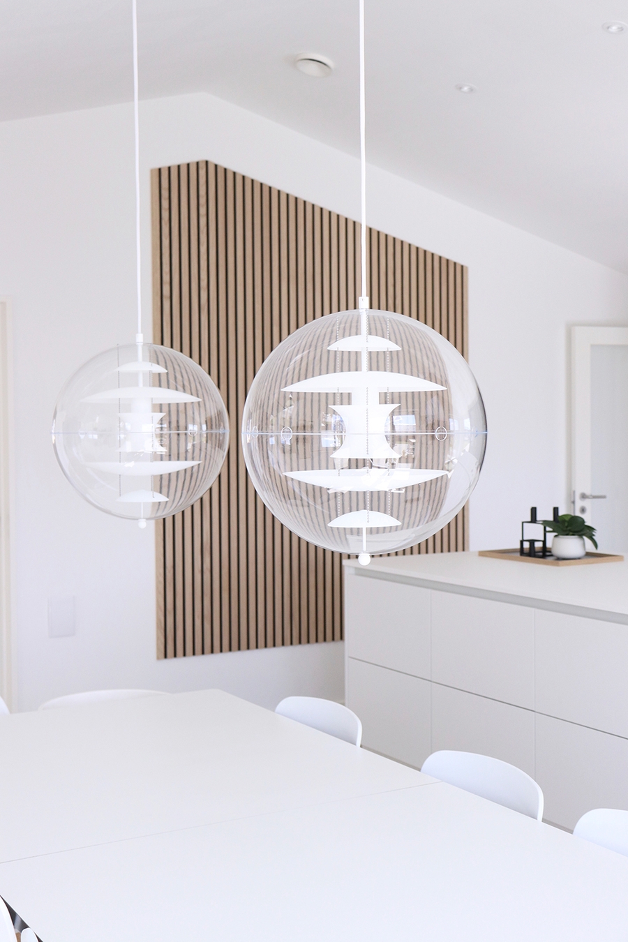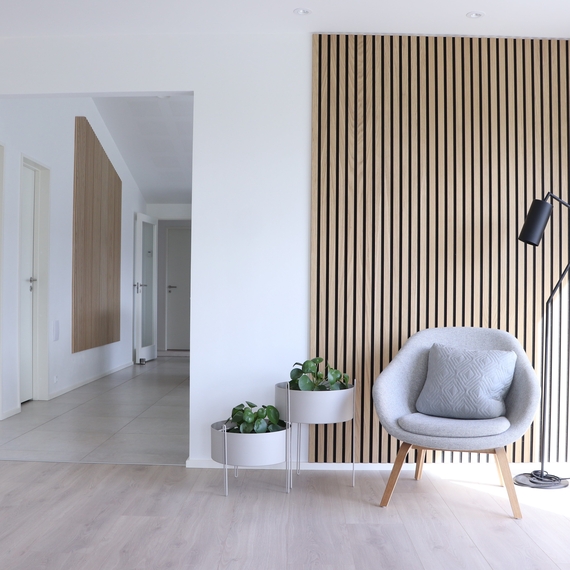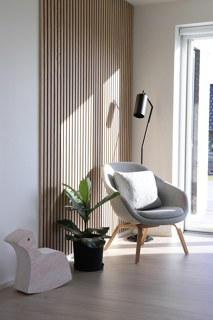 Instagrammerin und Influencerin Louise Laursen hat mit Wandpaneelen von I-Wood Denmark® in ihrem Haus die Akustik optimiert. Hier wird die gute Akustik in den großen, hellen Räumen in der Küche und im Wohnzimmer mit einer eleganten Optik vereint.