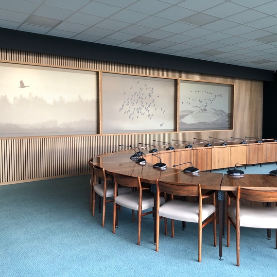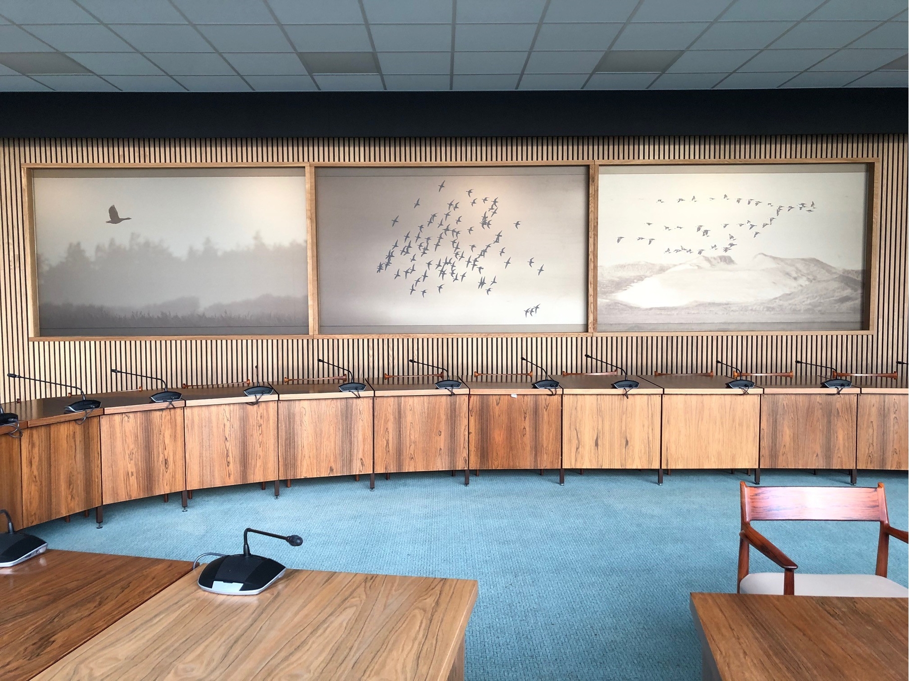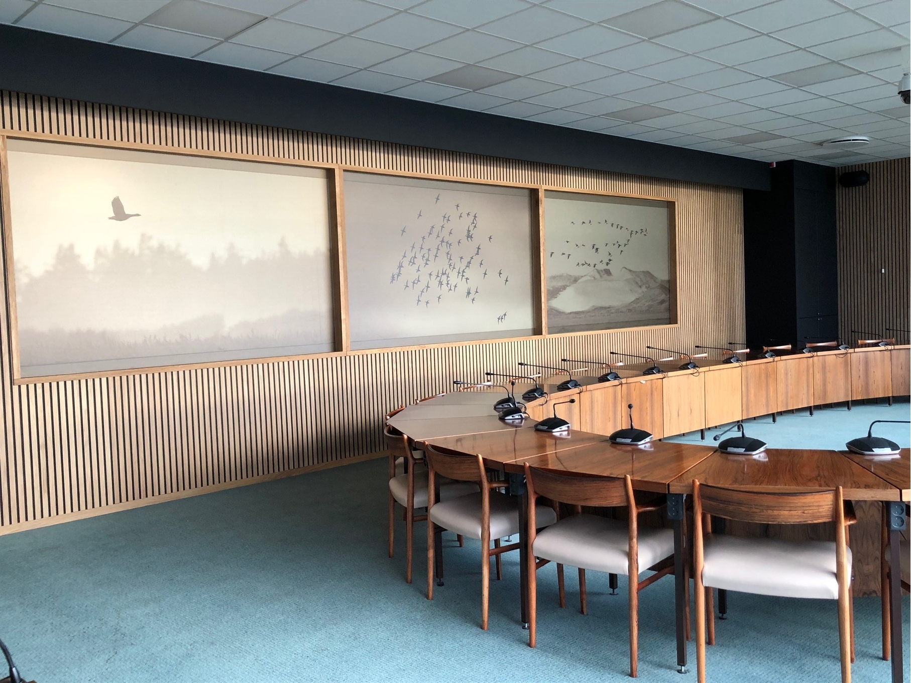 Die dunklen Holzwände wurden durch eine Akustikwand aus hellem Eichenholz ersetzt, die von drei Fenstern durchbrochen wird, die Licht aus der Rathaushalle hereinlassen. Die Fenster sind mit Naturmotiven verziert.