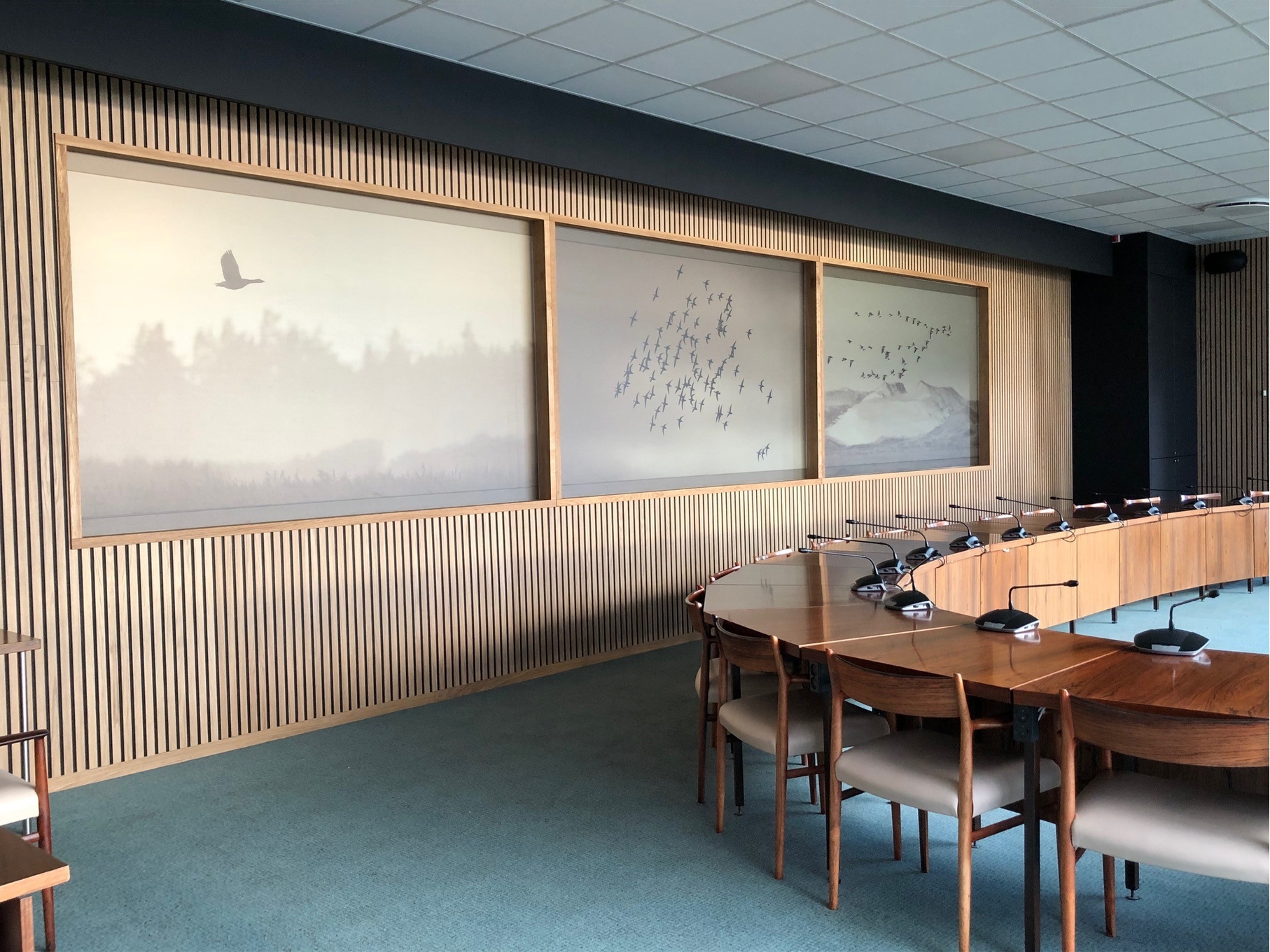 Das Rathaus in Ringkøbing ist nach 50 Jahren zum ersten Mal renoviert worden. Die Innenarchitektin Tina Switzer hat die dunkelbraunen altmodischen Materialien durch helle und neue, zeitlose Materialien ersetzt – unter anderem Akustikpaneele von I-Wood Denmark®.