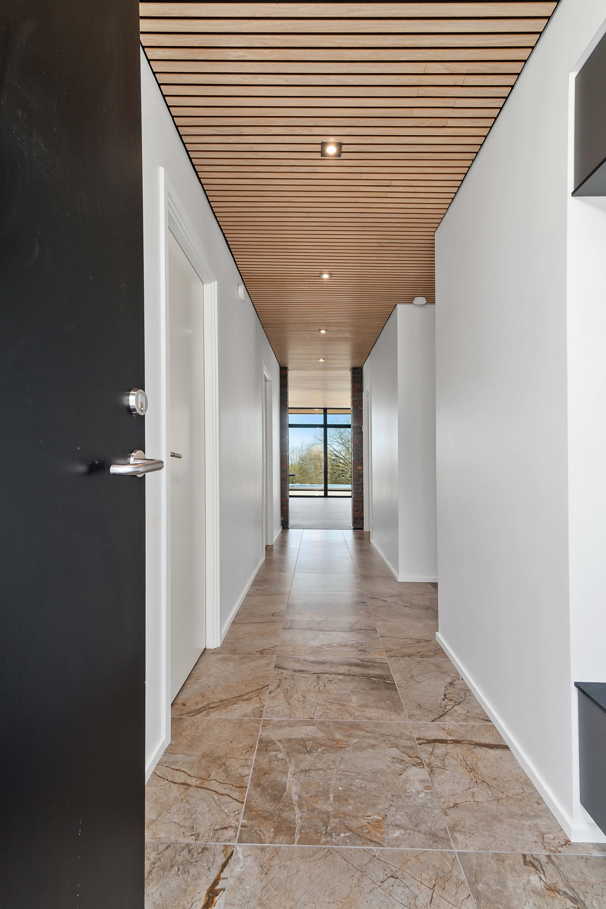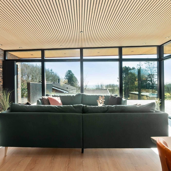Gerade deshalb fiel die Wahl für die Decke auf Akustikpaneele von I-Wood Denmark®. Das natürliche Holz bildet einen guten Kontrast zu den weißen Wänden und den harten Böden. Ohne Kompromisse bei Ästhetik oder der nordischen Designtradition einzugehen, die wir bei I-Wood Denmark® ebenfalls sehr schätzen.