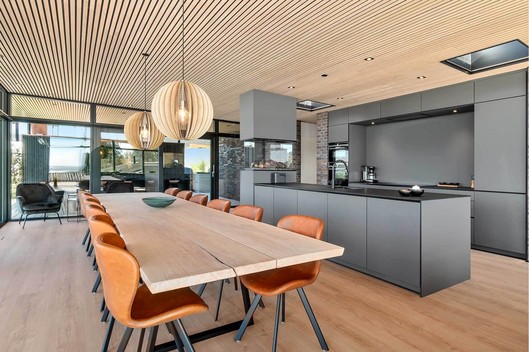 In diesem neu gebauten Ferienhaus in Knebel lag von Anfang an der Fokus auf guten, natürlichen Materialien. Darüber hinaus ist die Absicht des Ferienhauses, einen Versammlungsort mit Räumen zu schaffen, in denen jeder gerne zusammen sein möchte.