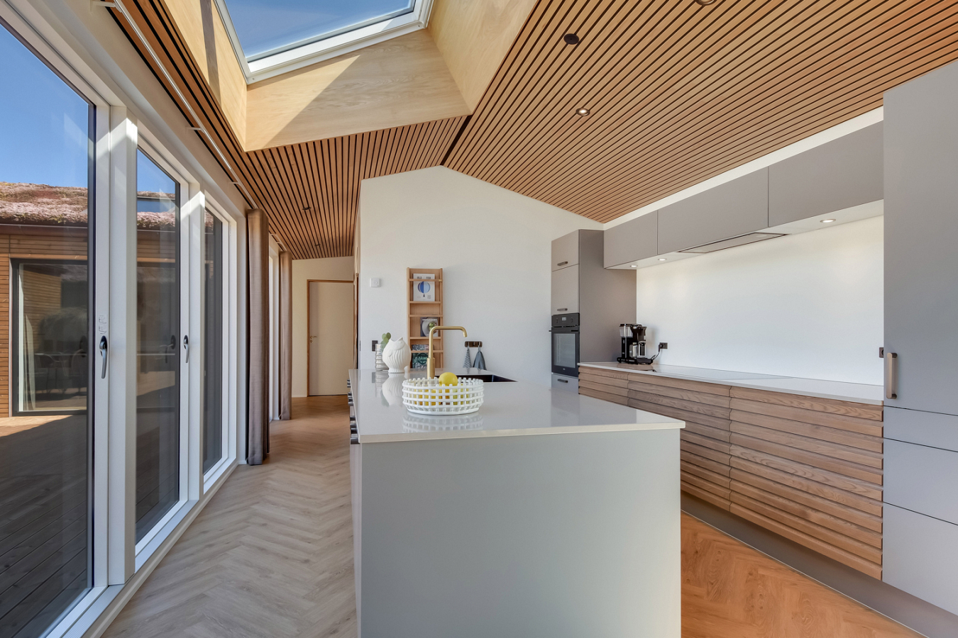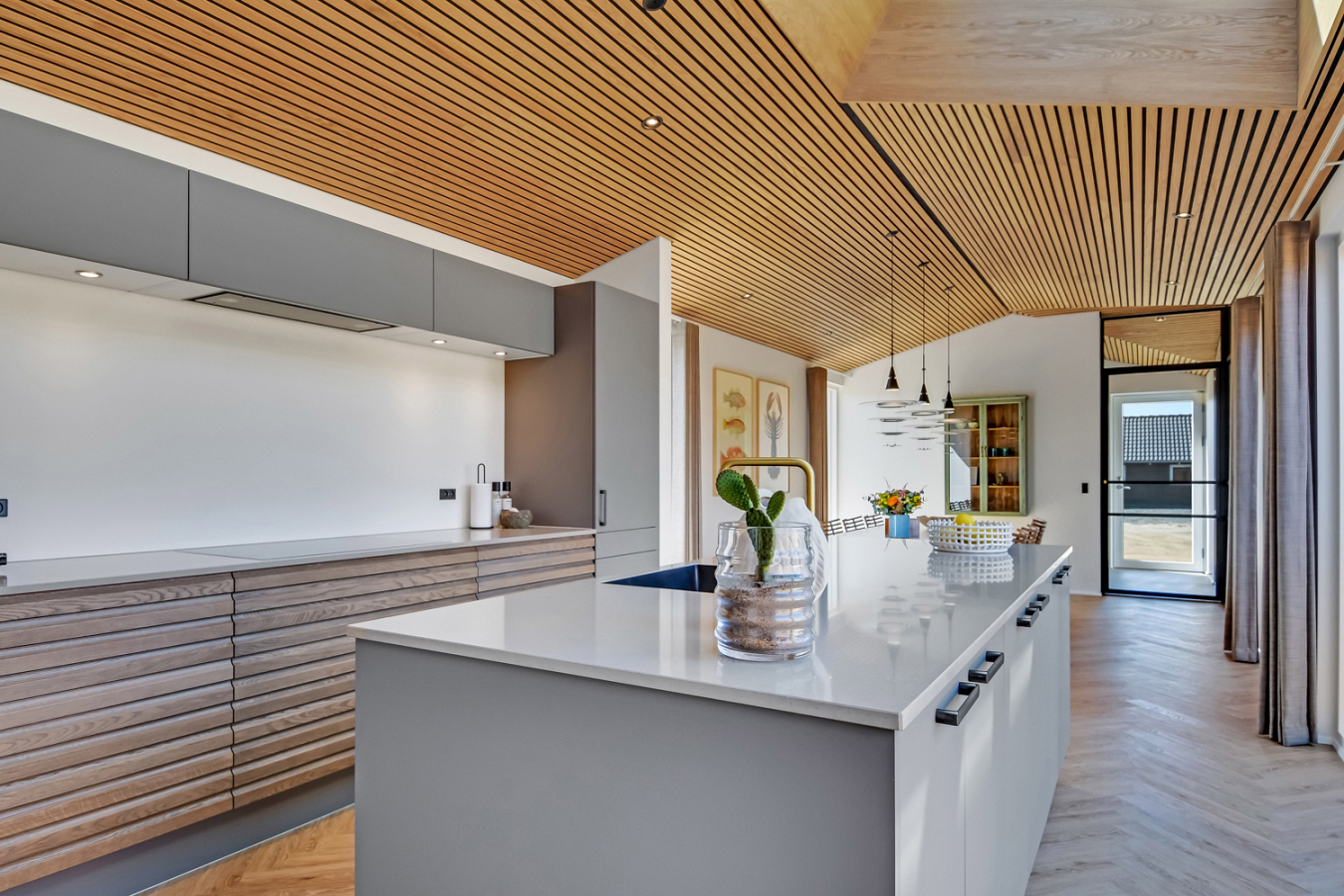 In einem Ferienhausgebiet in Vejlby Klit befindet sich dieses schöne Ferienhaus. Die Eigentümer haben für die Decken Akustikpaneele von I-Wood gewählt. Die Paneele bringen die Natur ins Haus, beseitigen unerwünschte Geräusche und sorgen für eine optimale Raumakustik. Die Paneele fügen sich harmonisch in die Umgebung ein und vereinen die Elemente mit den großen Dachfenstern.