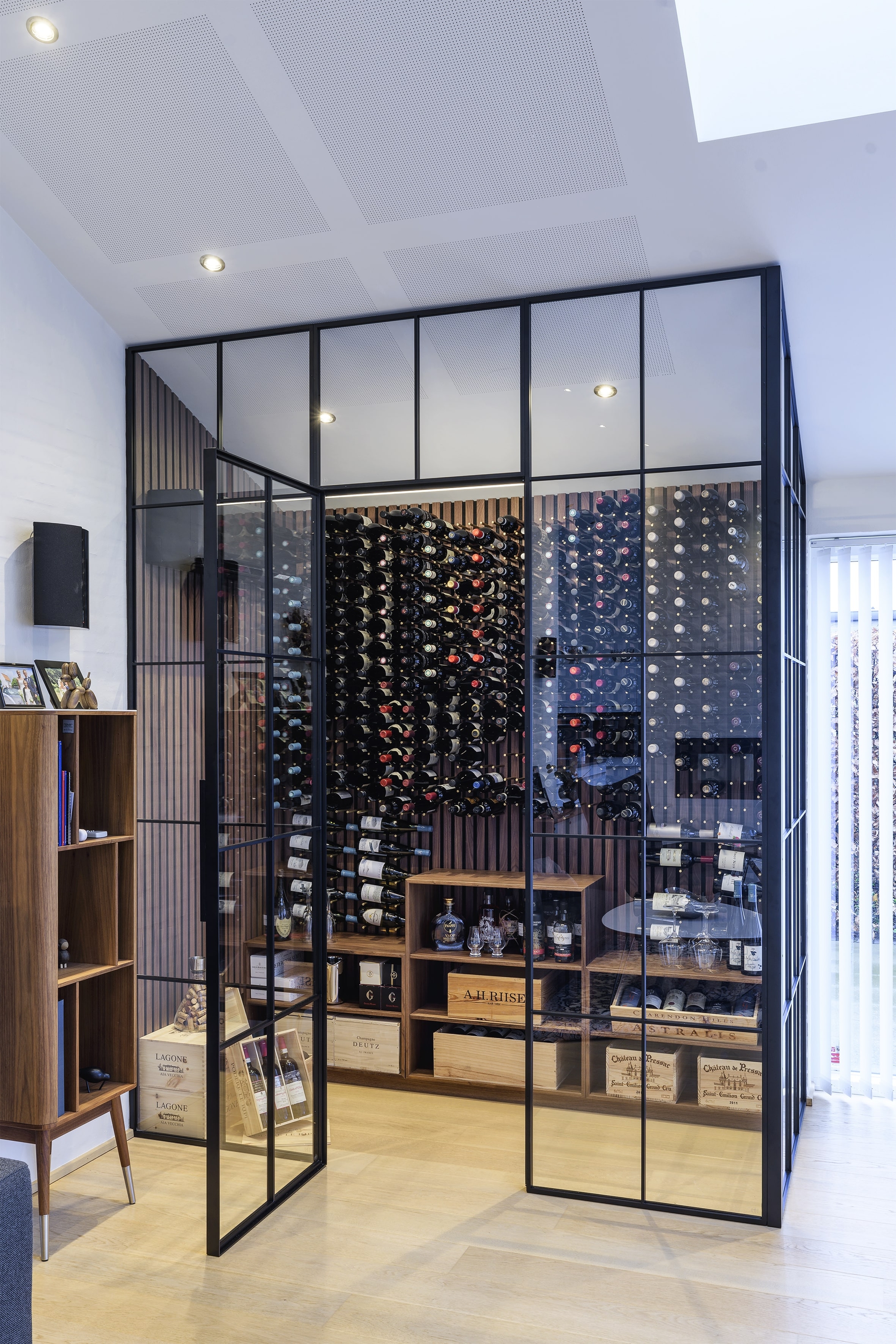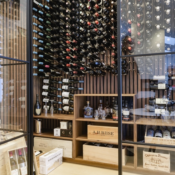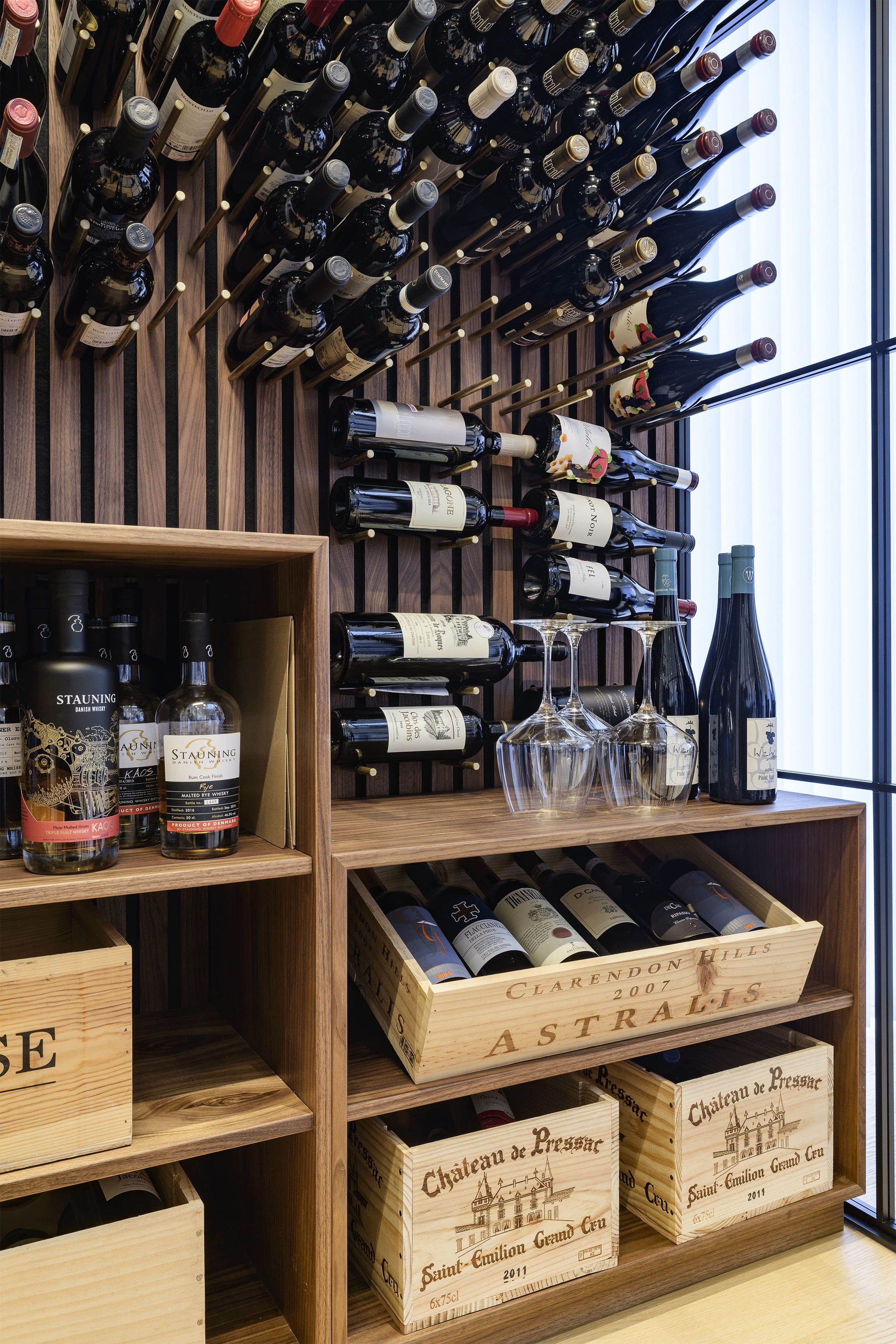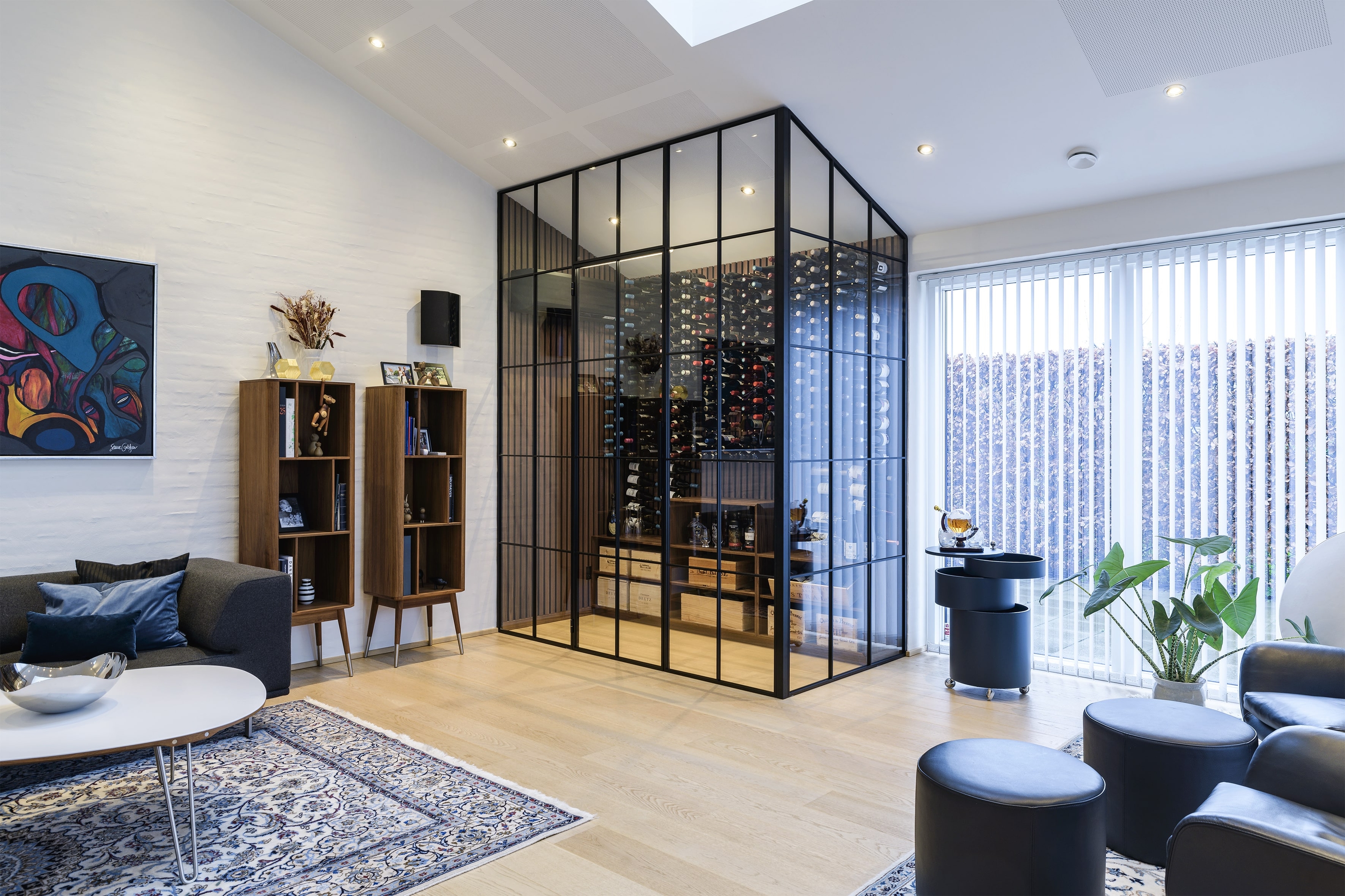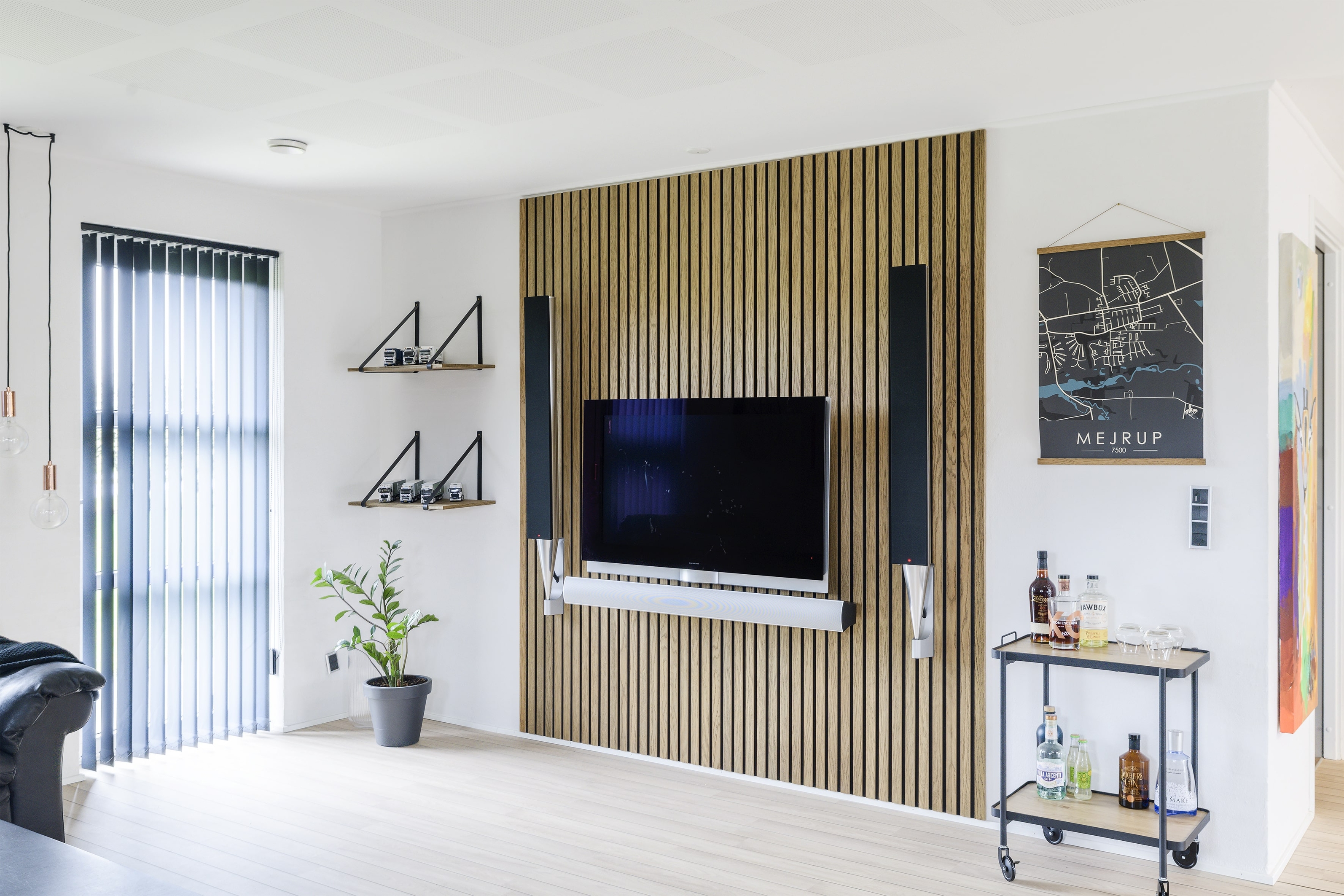 Bei der Gestaltung dieses edlen Weinraums wurden Holzpaneele von I-Wood Denmark® als Teil des Raumes vorgesehen. Die Lösung präsentiert die Weinflaschen in einer stilvollen und modernen Umgebung. Außerdem wurde im Wohnzimmer ein Rahmen aus Holzpaneelen für den Fernseher geschaffen und dabei gleichzeitig die Akustik verbessert.