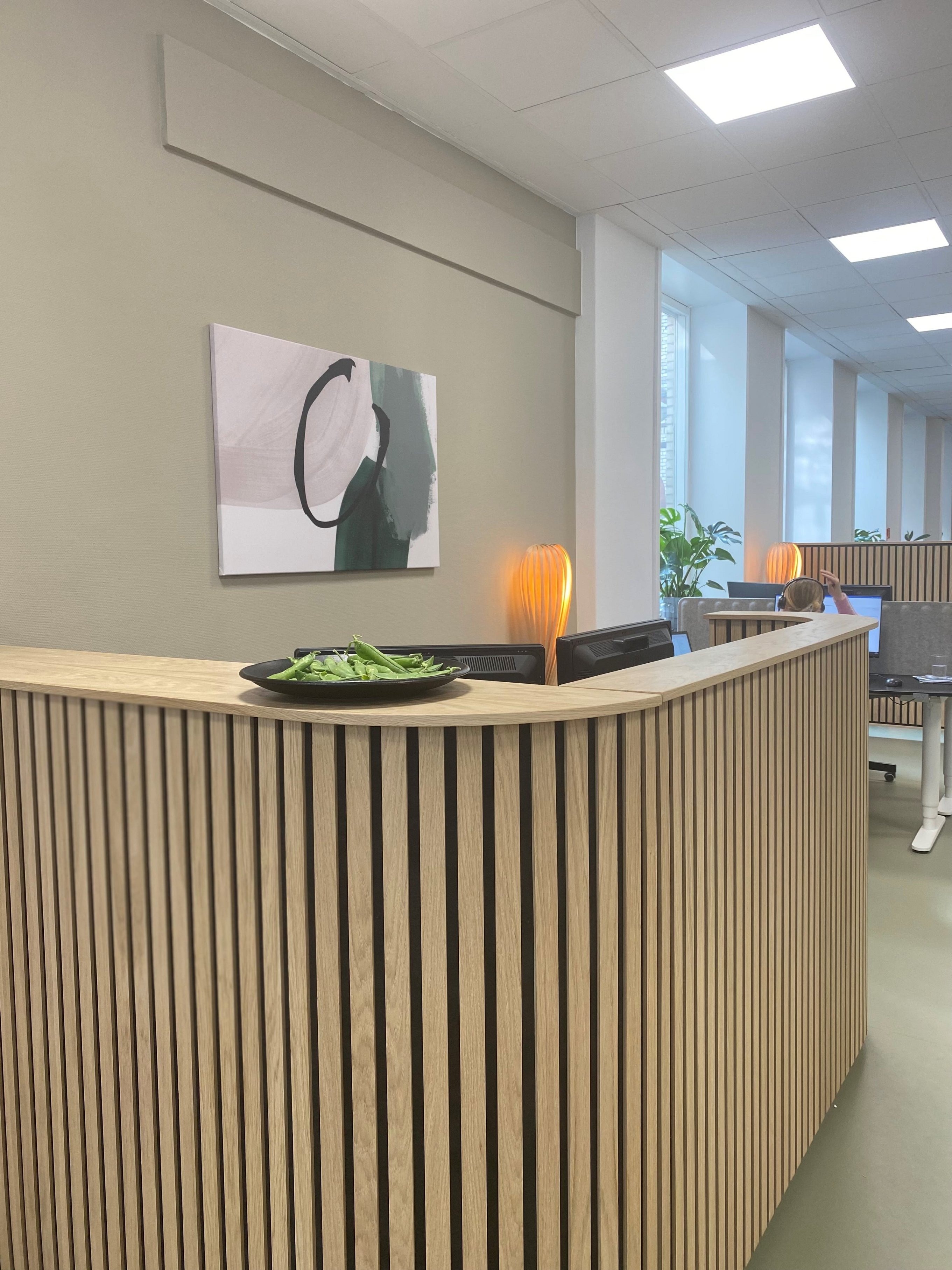Building Green arbeitet daran, eine Community für nachhaltiges Bauen aufzubauen. Deshalb hat es auch perfekt gepasst, als sie sich für I-Wood Flexi Wall sowie für eine Empfangstheke mit den schönen Holzpaneelen von I-Wood Denmark® entschieden haben. Auf diese Weise hat Building Green die Natur ins Haus geholt und gleichzeitig eine Lösung erhalten, die der Ästhetik und der Akustik am Arbeitsplatz zugutekommt.