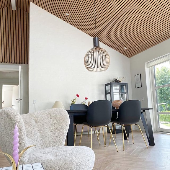 Instagrammerin und Influencerin Ditte Estrup schuf mit einer neuen Decke von I-Wood eine bessere Akustik für ihre Familie. Jetzt vereint der große, helle Raum mit hoher Decke eine elegante Ästhetik mit einer guten Akustik.