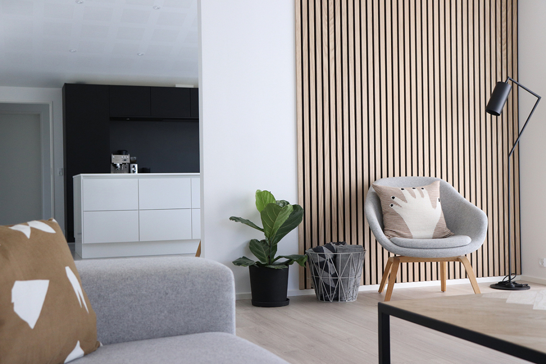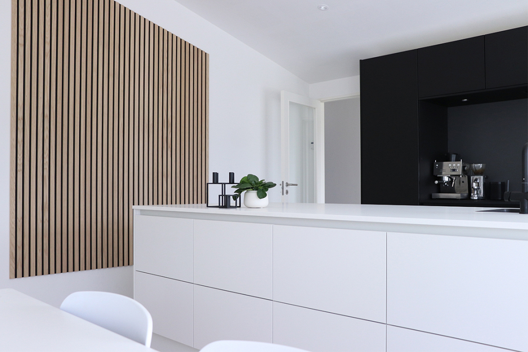 Instagrammerin und Influencerin Louise Laursen hat mit Wandpaneelen von I-Wood Denmark® in ihrem Haus die Akustik optimiert. Hier wird die gute Akustik in den großen, hellen Räumen in der Küche und im Wohnzimmer mit einer eleganten Optik vereint.