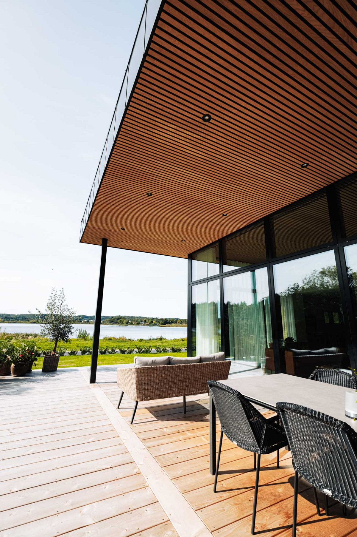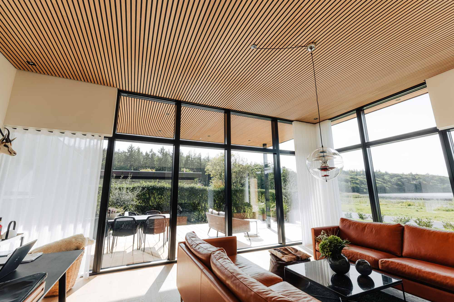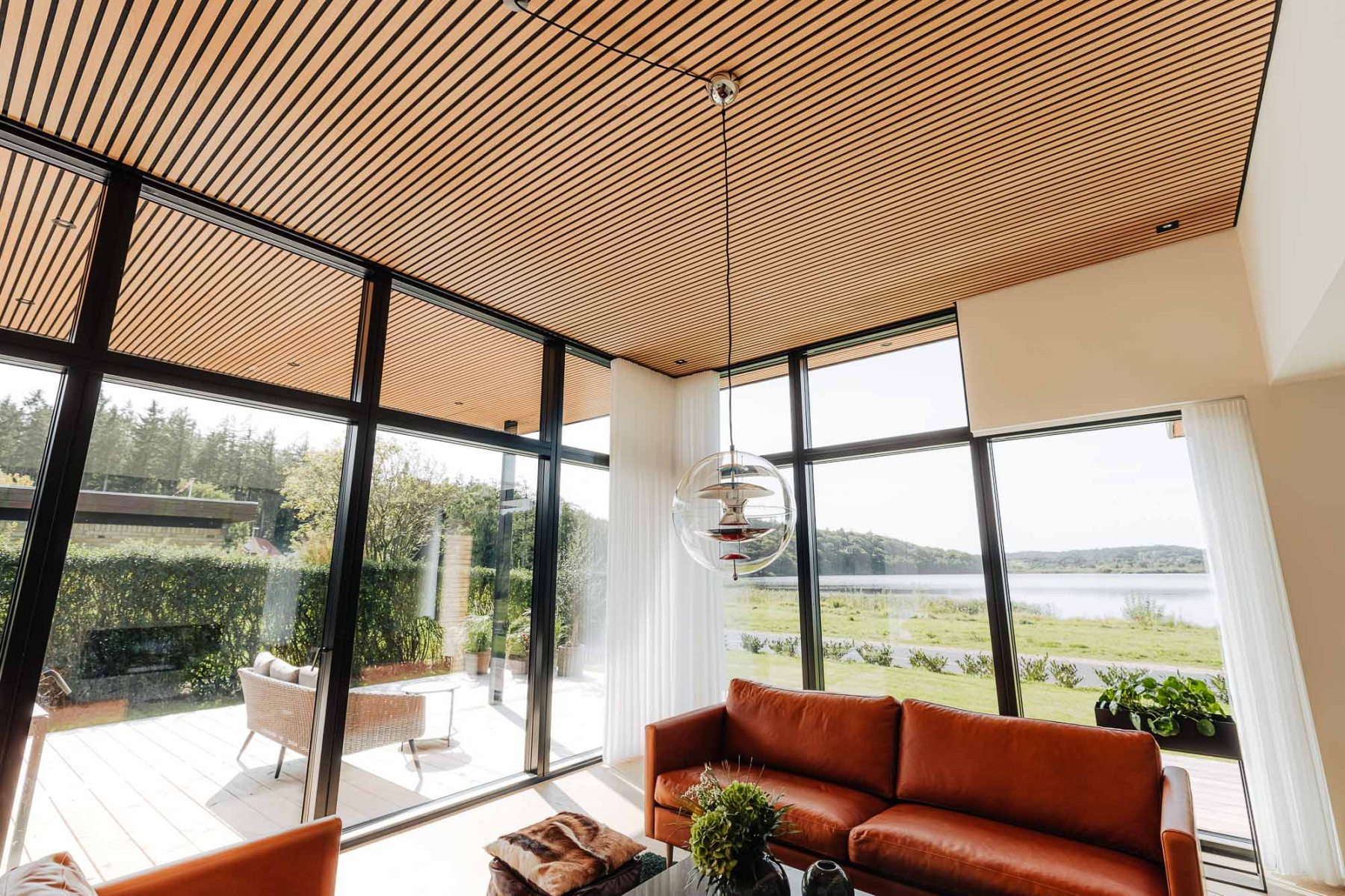 In einem Privathaus in Ry sollte zwischen Wohnzimmer und Terrasse eine stilvolle und originelle Verbindung geschaffen werden. Hierzu wurden Deckenpaneele von I-Wood Denmark® ausgewählt, die für eine natürliche Optik sorgen. Da die akustischen Deckenpaneele sowohl im Wohnzimmer als auch auf der Terrasse angebracht wurden, herrschen innen und außen die gleiche gute Akustik und schöne Ästhetik.
