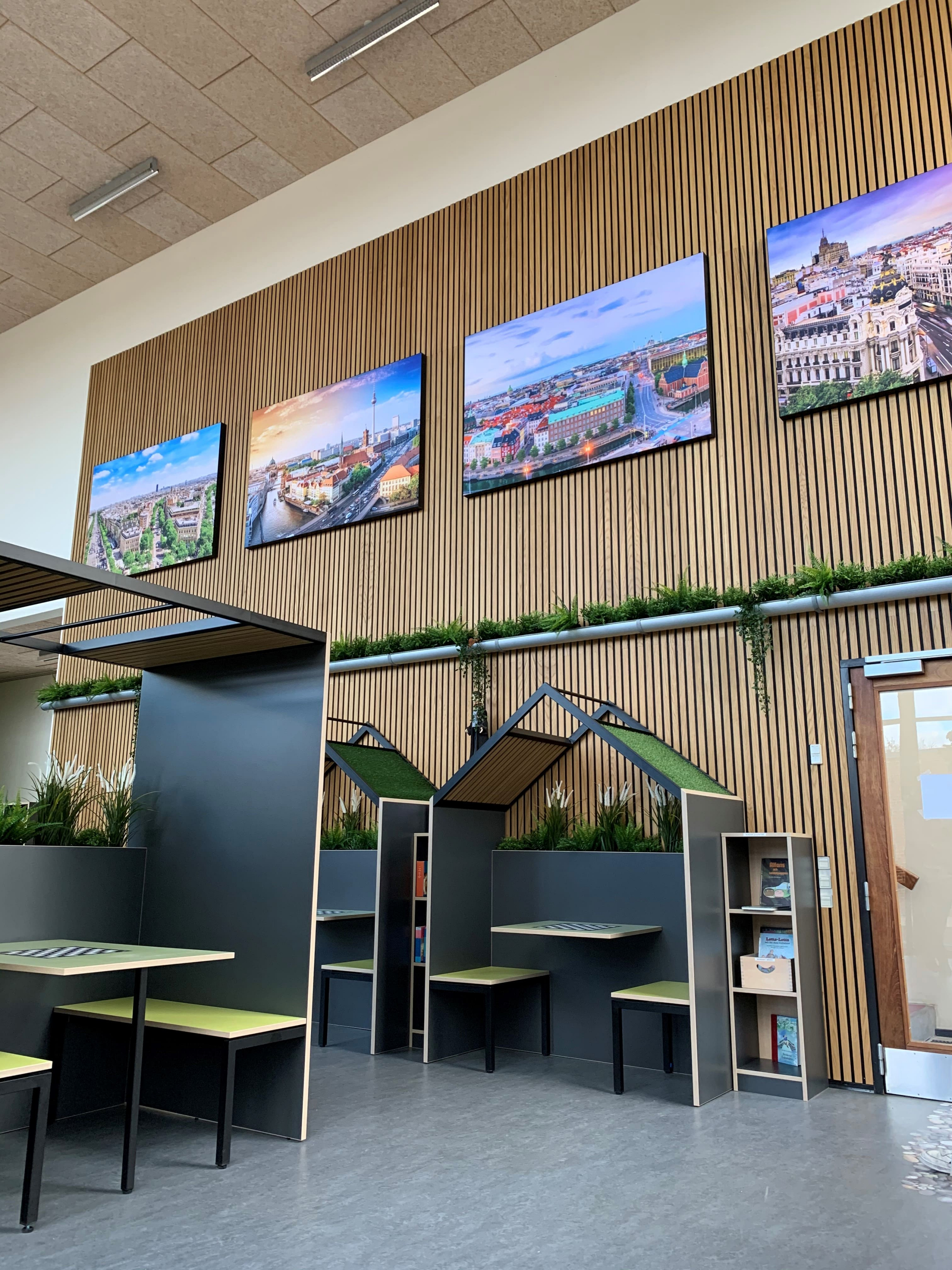 In der Utterslev-Schule in Kopenhagen kommen viele Menschen in großen Räumen zusammen, was die Akustik sowohl für Kinder als auch für Erwachsene beeinträchtigen kann. Mit Wandpaneelen von I-Wood Denmark® wurde die Akustik verbessert und gleichzeitig die Ästhetik aufgewertet, sodass die Kinder nun in einem schönen und angenehmen Umfeld lernen. Angeregt durch die Stadt wurden im Gebäude verschiedene Bereiche unter anderem mit kleinen Häusern geschaffen. Dieses Projekt wurde in Zusammenarbeit mit Ultima K abgewickelt.