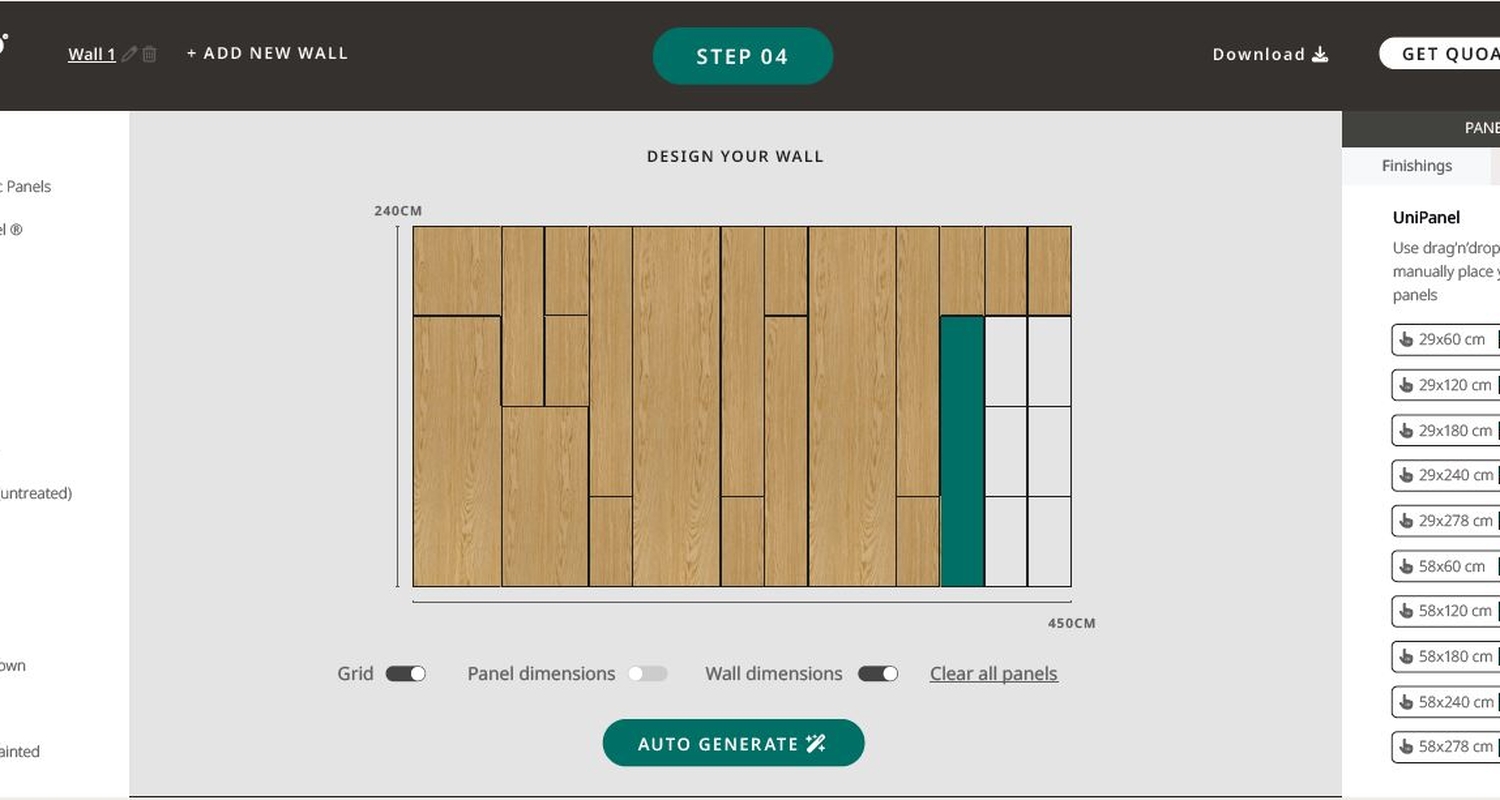 Es war noch nie so einfach, Ihre Designideen zu visualisieren und anzupassen. Nutzen Sie unser digitales Design-Tool, I-Wood Studio. Geben Sie die Wandmaße ein und erstellen Sie Ihr eigenes Puzzle, indem Sie verschiedene Größen kombinieren – oder lassen Sie I-Wood Studio dies für Sie übernehmen. Es war noch nie einfacher, ein maßgeschneidertes Design zu erstellen, das perfekt zu Ihrem Projekt passt.